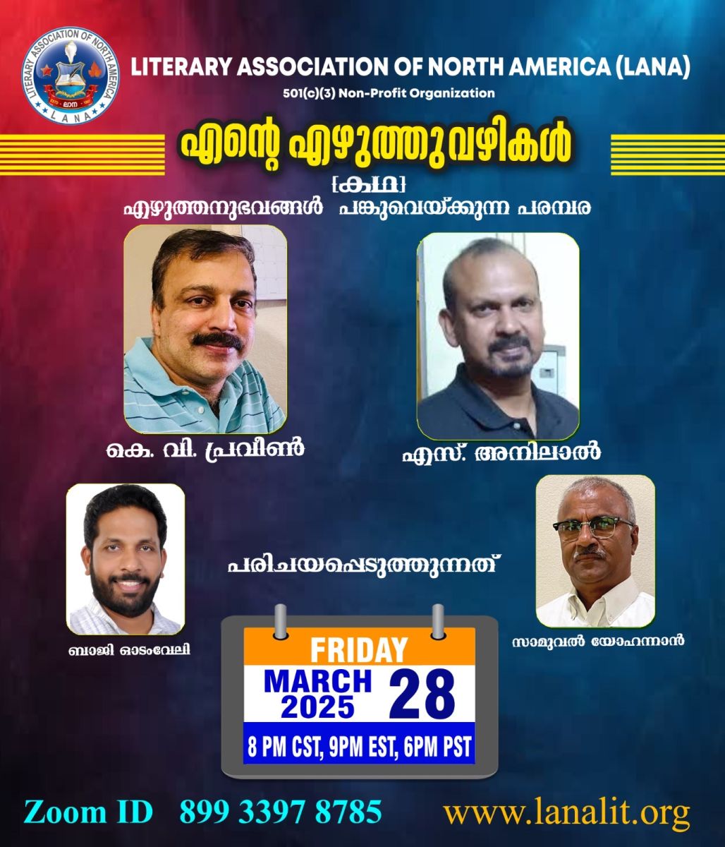 ലിറ്റററി അസോസ്സിയേഷൻ ഓഫ് നോർത്ത് അമേരിക്ക (ലാന) -യുടെ 2024-25 വർഷത്തിൽ സംഘടിപ്പിക്കുന്ന “എന്റെ എഴുത്തുവഴികൾ” എന്ന എഴുത്തുകാരുടെ എഴുത്തനുഭവങ്ങൾ പങ്കുവയ്ക്കുന്ന പരമ്പര മാർച്ച് 28 വെള്ളിയാഴ്ച്ച (8 PM CST/9PM EST/6 PM PST) സൂമിലുടെ നടക്കും. പങ്കെടുക്കുന്ന എഴുത്തുകാർ അവരുടെ രചനകളെക്കുറിച്ചും, രചനാനുഭവങ്ങളെക്കുറിച്ചും, രചനക്ക് കാരണമായ പ്രചോദനങ്ങളെക്കുറിച്ചുമെല്ലാം പ്രതിപാദിക്കുകയും ചർച്ച ചെയ്യുകയും ചെയ്യുന്ന പരിപാടിയാണ് “എന്റെ എഴുത്തുവഴികൾ” .