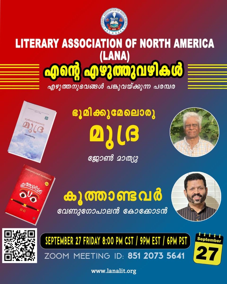 ലിറ്റററി അസോസ്സിയേഷൻ ഓഫ് നോർത്ത് അമേരിക്ക (ലാന) -യുടെ 2024-25 വർഷത്തിൽ സംഘടിപ്പിക്കുന്ന “എന്റെ എഴുത്തുവഴികൾ” എന്ന എഴുത്തുകാരുടെ എഴുത്തനുഭവങ്ങൾ പങ്കുവയ്ക്കുന്ന പരമ്പരയുടെ രണ്ടാമത്തെ പരിപാടി സെപ്റ്റംബർ 27 വെള്ളിയാഴ്ച്ച വൈകീട്ട് (8 PM CST/9PM EST/6 PM PST) സൂമിലുടെ നടക്കും. പങ്കെടുക്കുന്ന എഴുത്തുകാർ അവരുടെ രചനകളെക്കുറിച്ചും, രചനാനുഭവങ്ങളെക്കുറിച്ചും, രചനക്ക് കാരണമായ പ്രചോദനങ്ങളെക്കുറിച്ചുമെല്ലാം പ്രതിപാദിക്കുകയും ചർച്ച ചെയ്യുകയും ചെയ്യുന്ന പരിപാടിയാണ് “എന്റെ എഴുത്തുവഴികൾ” .