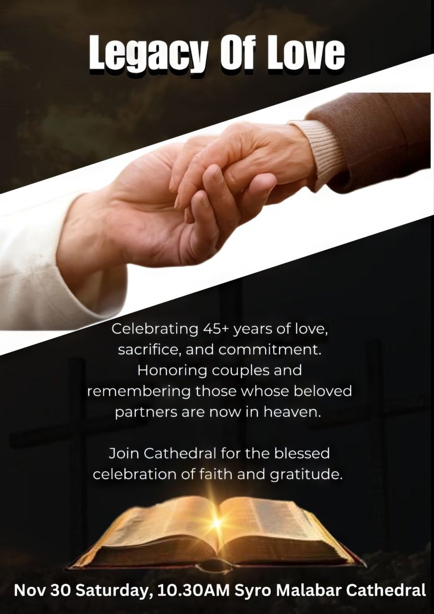 ബെൽവുഡിലുള്ള മാർ തോമാ സ്ലിഹാ കത്തിഡ്രലിൽ നവംബർ 30-ാം തിയതി ശനിയാഴ്ച രാവിലെ 10.30 ന് Legacy of Love എന്ന പേരിൽ ഒരു അതുല്യമായ ചടങ്ങ് നടത്തപ്പെടുന്നു.ഈ ചടങ്ങിൽ ദീർഘകാല ദാമ്പത്യജീവിതം നയിച്ച ദമ്പതികളുടെ സ്നേഹവും സമർപ്പണവും ആദരിക്കുകയും അവരുടെ വിശ്വാസപൂർണ കൂട്ടായ്മ ആഘോഷിക്കുകയും ചെയ്യുന്നു. കൂടാതെ, പ്രിയപ്പെട്ടവരിൽ നിത്യവിശ്രമം പ്രാപിച്ചവരെ സ്മരിച്ച് അവരുടെ സ്നേഹത്തിൻ്റെയും വിശ്വാസത്തിൻ്റെയും പാരമ്പര്യം അനുസ്മരിക്കുകയും ചെയ്യുന്നു.