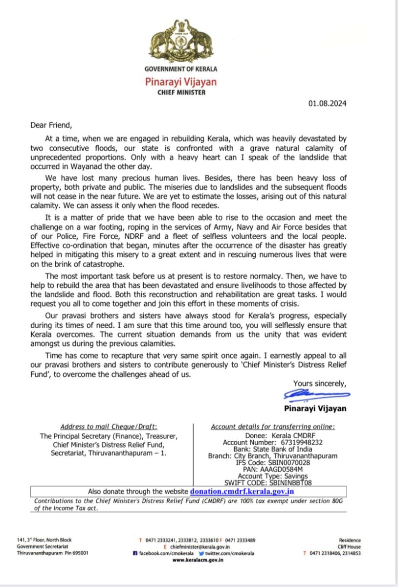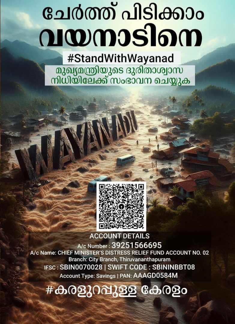 ജന്മനാടിനൊരു ആപത്തു വരുമ്പോൾ എന്നും കൂടെ നിൽക്കാറുള്ള പ്രവാസികളായ നമുക്ക് വയനാട്ടിൽ മുന്നൂറോളം പേരുടെ മരണത്തിലും ഇരുനൂറോളം പേരേ കാണാതാക്കുകയും ചെയ്ത് എല്ലാം നഷ്ടപ്പെട്ട നമ്മുടെ സഹോദരങ്ങൾക്കായി നമുക്ക് കൈ കോർക്കാം. രണ്ടു മൂന്നു ഗ്രാമങ്ങൾ തന്നെ തുടച്ചു നീക്കപ്പെട്ട നിലയിലാണ് . വീടുകൾ ,സ്കൂളുകൾ ,ആരാധനാലയങ്ങൾ ,സർക്കാർ ആഫീസുകൾ ,കച്ചവട സ്ഥാപനങ്ങൾ റോഡുകൾ ,പാലങ്ങൾഎല്ലാം നഷ്ടപ്പെട്ട ആ നാടിന് വേണ്ടി , അതെല്ലാം പുനർ നിർമ്മിക്കുന്നതിനുവേണ്ടി പ്രവാസികളായ നമുക്ക് സർക്കാരിനൊപ്പം നിന്ന് നമുക്ക് സഹായിക്കാം.