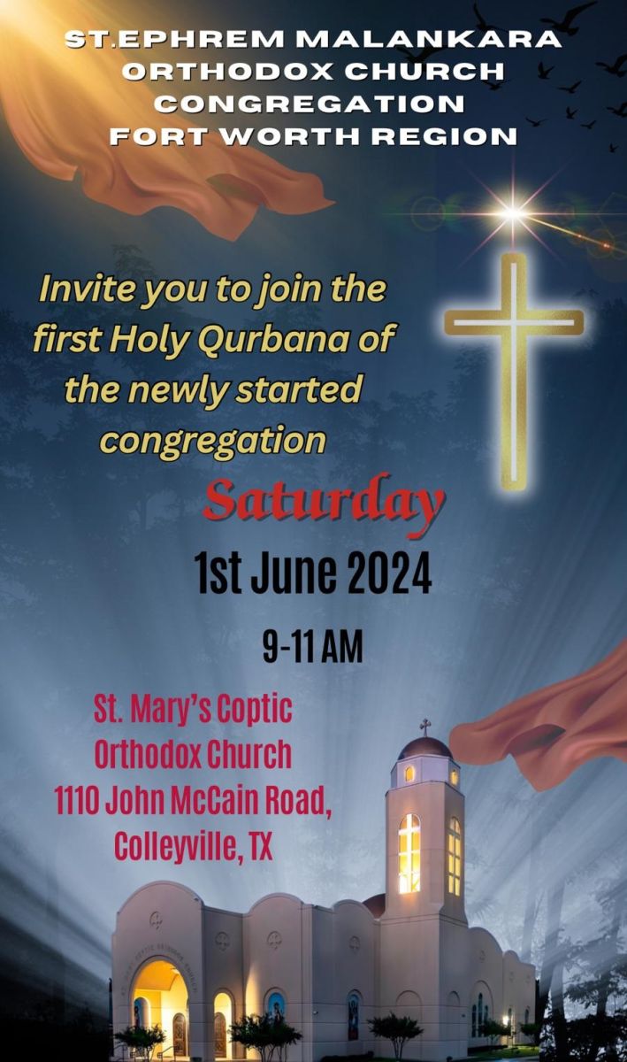 ഭദ്രാസന അധ്യക്ഷൻ ബിഷപ് ഡോ. തോമസ് മാർ ഇവാനിയോസ് മെത്രാപ്പൊലീത്തായുടെ കല്പന പ്രകാരം വിശുദ്ധ അപ്രേം പിതാവിന്റെ നാമധേയത്തിൽ ആരംഭിക്കുന്ന കോൺഗ്രിഗേഷൻ റവ.ഫാ.ജോൺ മാത്യുവിന്റെ നേതൃത്വത്തിൽ വിശുദ്ധ കുർബ്ബാന ശുശ്രുഷയോടുകൂടി ജൂൺ 1 ശനിയാഴ്ച രാവിലെ 9 മണിക്ക് തുടക്കം കുറിക്കും.