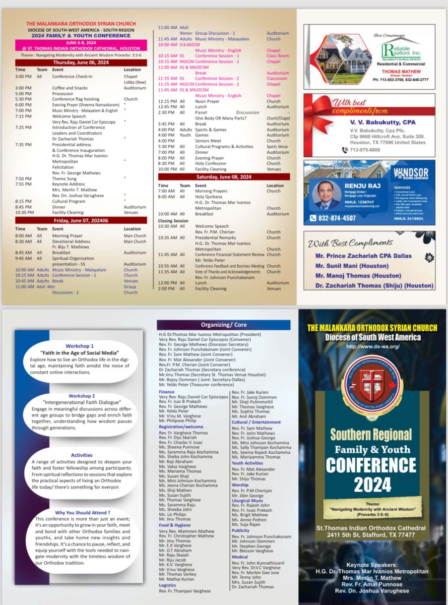 ഹൂസ്റ്റണിലെ സെന്റ് തോമസ് ഓർത്തഡോക്സ് കത്തീഡ്രൽ ദേവാലയത്തിൽ നടക്കുന്ന കോൺഫ്രൻസിൽ ഹൂസ്റ്റൺ/ ഡാളസ് ഉൾപ്പെടെ സതേൺ റീജിയനിലുള്ള വിവിധ ദേവാലയങ്ങളിൽ നിന്ന് 468 ൽപരം വിശ്വാസികൾ പങ്കെടുക്കും. വിശ്വാസികളുടെ ആത്മീയ ജീവിതത്തിന് പ്രചോദനമേകുന്ന വിവിധ സെഷനുകൾ ക്രമീകരിച്ചിട്ടുണ്ട്.
