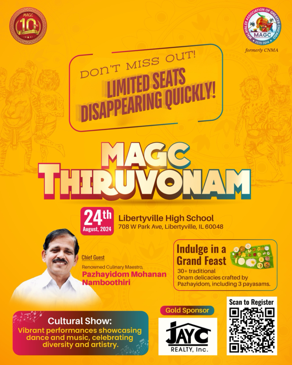 ഷിക്കാഗോ: MAGC, Malayalee Association of Greater Chicago യുടെ 2024 ഓണാഘോഷ പരിപാടികൾ ആഗസ്റ്റ് 24ആം തീയതി ശനിയാഴ്ച്ച ലിബർട്ടിവിൽ ഹൈസ്കൂളിൽ വച്ച് നടത്തപ്പെടുന്നു. പാചക കുലപതി ശ്രീ പഴയിടം മോഹനൻ നമ്പൂതിരി മുഖ്യാതിഥിയായി എത്തുന്ന ആഘോഷപരിപാടികളിൽ, അദ്ദേഹത്തിന്റെ രുചിവിസ്മയം ഷിക്കാഗോ മലയാളികൾക്ക് നേരിട്ടനുഭവിക്കാൻ അവസരമൊരുക്കിക്കൊണ്ട് 30 ലധികം വിഭവങ്ങളും 3 പായസവും അടങ്ങിയ സമൃദ്ധമായ സദ്യക്കുള്ള ഒരുക്കങ്ങൾ നടന്നുകൊണ്ടിരിക്കുന്നു. പരിപാടിയോടനുബന്ധിച്ച് മിഡ് വെസ്റ്റിലെ പ്രഗത്ഭരായ കലാകാരൻമാർ അണിയിച്ചൊരുക്കുന്ന കലാസായാഹ്നവും ആഘോഷങ്ങൾക്ക് മാറ്റ് കൂട്ടും. ആഗസ്റ്റ് 24 വരെ നീണ്ടുനില്ക്കുന്ന റീൽ ചലെഞ്ച് പോലുള്ള വിവിധ മത്സര പരിപാടികളും ഇതിനോടൊപ്പം സംഘടിപ്പിക്കുന്നുണ്ട്. സദ്യയുടെ പന്തി തിരഞ്ഞെടുക്കൽ, മറ്റ് ആഘോഷപരിപാടികളെ സംബന്ധിച്ച വിവരങ്ങൾ, സമയക്രമം തുടങ്ങിയവ MAGC വെബ്സൈറ്റായ www.magconline.com ൽ ലഭ്യമാണ്. MAGCയുടെ 10ആം വാർഷികത്തോടനുബന്ധിച്ചുള്ള ഈ ബൃഹത്തായ ഓണാഘോഷ പരിപാടികളിലേക്ക് എല്ലാ ഷിക്കാഗോ മലയാളികളെയും ഹൃദയപൂർവം ക്ഷണിക്കുന്നതായി പ്രസിഡന്റ് സുശീൽ വരയില്ലം, കമ്മറ്റി അംഗങ്ങളായ ഷൈലേഷ് മേനോൻ, മണികണ്ഠൻ ചന്ദ്രൻ, സ്വപ്ന വേണുഗോപാൽ, രണൺദീപ് രഘു എന്നിവർ അറിയിച്ചു.