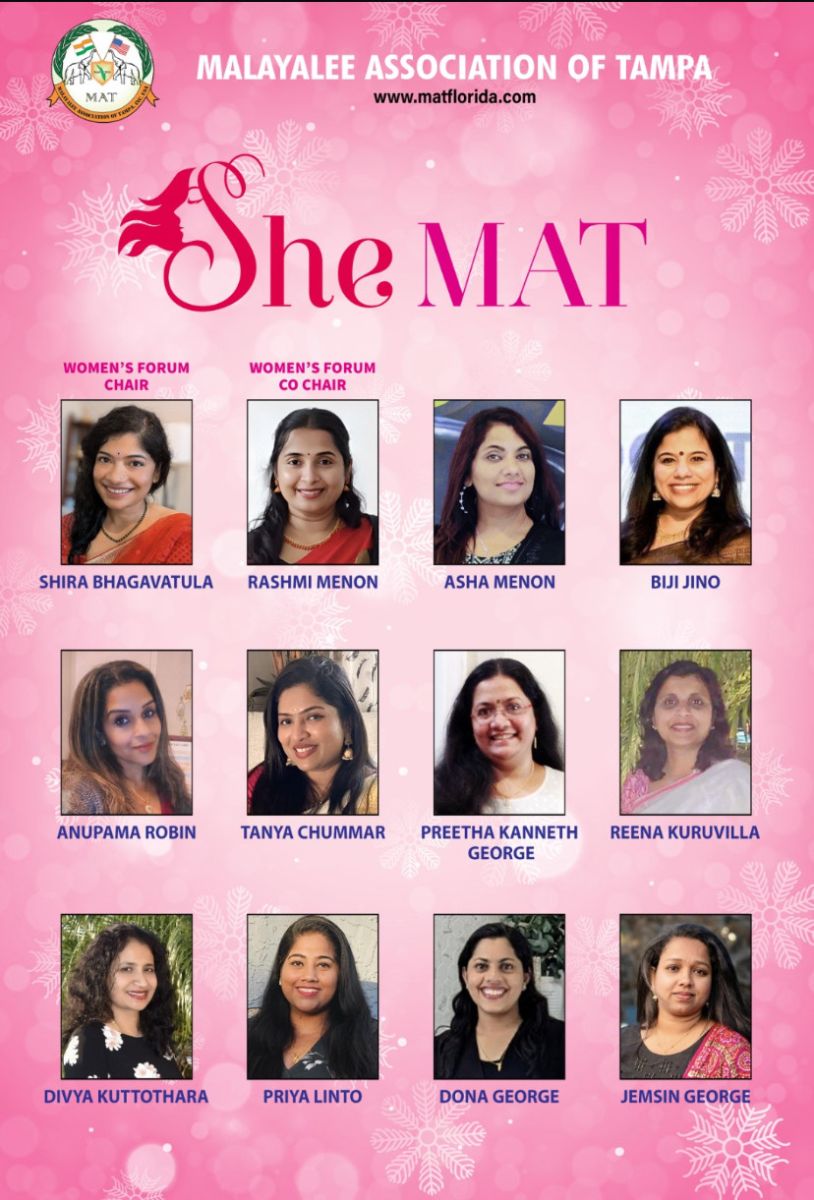 ടാമ്പാ: മലയാളി അസോസിയേഷന് ഓഫ് ടാമ്പായുടെ വനിതാ വിഭാഗമായ ഷീ മാറ്റിന്റെ (She MAT) ആഭിമുഖ്യത്തില് അന്താരാഷ്ട്ര വനിതാദിനം വര്ണ്ണശബളമായ പരിപാടികളോടു കൂടി വിപുലമായി ആഘോഷിക്കുന്നു.