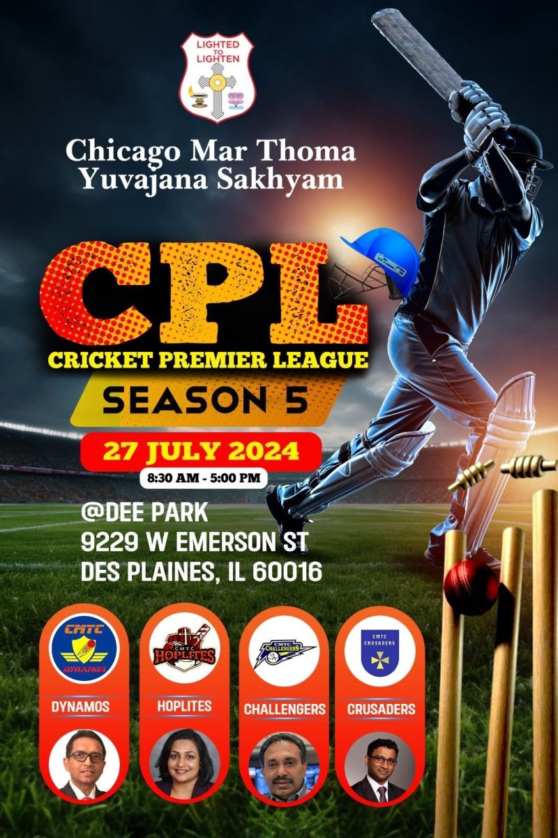 ചിക്കാഗൊ മാർത്തോമ്മാ യുവജനസഖ്യത്തിന്റെ ആഭിമുഖ്യത്തിൽ നടത്തിവരുന്ന 5 മത് മാർത്തോമ്മാ ക്രിക്കറ്റ് പ്രീമിയർ ലീഗ് 2024 ജൂലൈ മാസം 27 തീയതി ശനിയാഴ്ച ,ഡെസ്പലയിൻസ്, ഡീ പാർക്ക് ക്രിക്കറ്റ് സ്റ്റേഡിയത്തിൽ വച്ചു നടത്തപ്പെടുന്നു. ചിക്കാഗോയിലെ വിവിധ ക്രിക്കറ്റ് ടീമുകളിൽ അംഗങ്ങൾ ആയിട്ടുളളവർ ഈ വർഷത്തെ മാർത്തോമ്മാ ക്രിക്കറ്റ് പ്രീമിയർ ലീഗിലെ വിവിധ ടീമുകളിലായി പങ്കെടുക്കും. ഈ വർഷത്തെ ക്രിക്കറ്റ് പ്രീമിയർ ലീഗ് ചാക്കാഗൊ മാർത്തോമ്മാ യുവജനസഖ്യത്തിന്റെ പ്രസിഡന്റ് റവ. എബി. എം തോമസ് തരകൻ ഉൽഘാടനം ചെയ്യും, റവ.ബിജു വൈ അച്ചൻ മുഖ്യ അതിഥി ആയിരിക്കും. പ്രസ്തുത ക്രിക്കറ്റ് പ്രീമിയർ ലീഗിന്റെ സുഗമമായ നടത്തിപ്പിനായി സഖ്യം സെക്രട്ടറി ശ്രീ. ലിനു ഏം ജോസഫിന്റെ നേതൃത്വത്തിൽ ശ്രീ.അജു മാത്യു, ശ്രീ. ജോമി റോഷൻ വർഗീസ് എന്നിവർ കൺവീനേഴ്സായി പ്രത്യേക കമ്മറ്റി ലീഗിന്റെ ക്രമീകരണങ്ങൾക്ക് നേതൃത്വം നൽകുന്നു. ഈ വർഷത്തെ മാർത്തോമ്മാ ക്രിക്കറ്റ് പ്രീമിയർ ലീഗിലേക്ക് ഏവരെയും സ്വാഗതം ചെയ്യുന്നതായി സംഘാടകസമിതി അറിയിച്ചു.