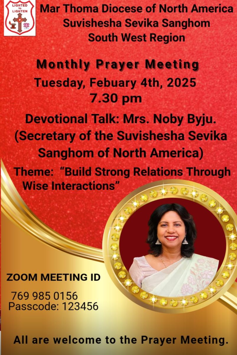 ഡാളസ് : നോർത്ത് അമേരിക്ക മാർത്തോമാ ഭദ്രാസനം സുവിശേഷ സേവികാ സംഘം സൗത്ത് വെസ്റ് മേഖല സമ്മേളനം സംഘടിപ്പിക്കുന്നു .ഫെബ്രു 4 ചൊവ്വാഴ്ച, വൈകുന്നേരം 7.30 ന് സൂം ഫ്ലാറ്റുഫോമിൽ ചേരുന്ന സമ്മേളനത്തിൽ നോർത്ത് അമേരിക്ക മാർത്തോമാ ഭദ്രാസനം സുവിശേഷ സേവികാ സംഘം സെക്രട്ടറി നോബി ബൈജു മുഖ്യ സന്ദേശം നൽകുന്നു