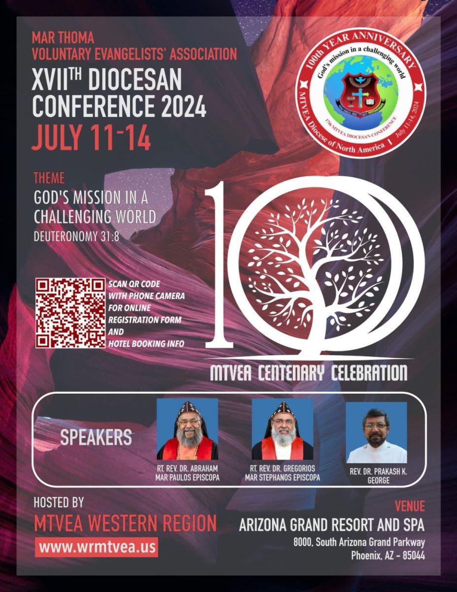 ഫീനിക്സ്/ലോസ് ഏഞ്ചലസ്: ശതാബ്ദി ആഘോഷിക്കുന്ന മാര്ത്തോമ്മാ സന്നദ്ധ സുവിശേഷക സംഘത്തിന്റെ പതിനേഴാമത് ദ്വൈവാര്ഷിക ഭദ്രാസന കോണ്ഫറന്സിന് അരിസോണയിലെ ഗ്രാന്ഡ് റിസോര്ട്ടില് 11-ന് തുടക്കമാകും. അമേരിക്കന് ഭദ്രാസനാദ്ധ്യക്ഷന് ഡോ. ഏബ്രഹാം മാര് പൗലോസ് ഉദ്ഘാടനം ചെയ്യും. സംഘം പ്രസിഡണ്ട് ഡോ. ഗ്രിഗോറിയോസ് മാര് സ്തേഫാനോസ് അദ്ധ്യക്ഷത വഹിക്കും. ഭദ്രാസന സെക്രട്ടറി റവ. ജോര്ജ് ഏബ്രഹാം, കോണ്ഫറന്സ് പ്രസിഡണ്ട് റവ. ഗീവര്ഗീസ് കൊച്ചുമ്മന്, ജനറല് കണ്വീനര് രാജേഷ് മാത്യു, ട്രഷറര് വര്ഗീസ് ജോസഫ്, അസംബ്ലി മെംബര് വിനോദ് വര്ഗീസ് എന്നിവര് പ്രസംഗിക്കും. 'വെല്ലുവിളികള് നിറഞ്ഞ ലോകത്ത് ദൈവത്തിന്റെ ദൗത്യം' എന്ന ചിന്താവിഷയം അടിസ്ഥാനമാക്കിയുള്ള സന്ദേശങ്ങള് നല്കപ്പെടും. ഡോ. ഗ്രിഗോറിയോസ് മാര് സ്തേഫാനോസ്, മാര്ത്തോമ്മാ വൈദിക സെമിനാരി മുന് പ്രിന്സിപ്പലും വേദശാസ്ത്ര പണ്ഡിതനുമായ റവ.ഡോ. പ്രകാശ് കെ. ജോര്ജ് എന്നിവര് സെഷനുകള്ക്ക് നേതൃത്വം നല്കും.