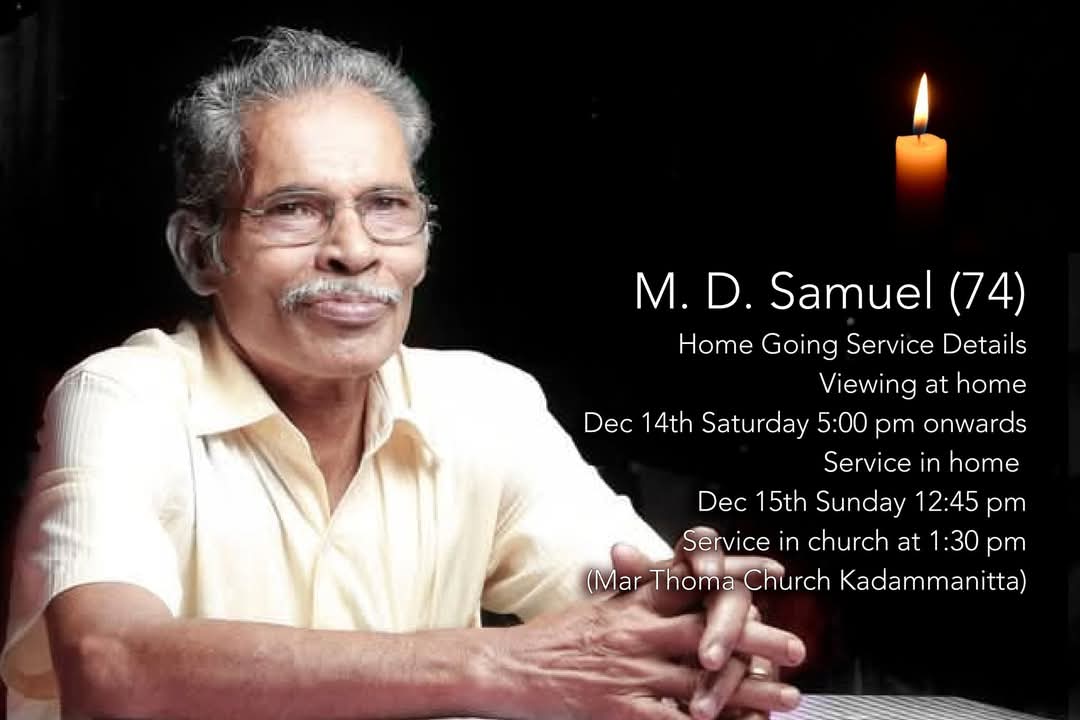 കടമ്മനിട്ട :വിമുക്തഭടൻ മാടപ്പള്ളിൽ എം.ഡി.സാമുവൽ (74) അന്തരിച്ചു. സംസ്കാരം ഞായർ 1.30ന് മാർത്തോമ്മാ പള്ളിയിൽ. ഭാര്യ: കടമ്മനിട്ട പുളിക്കക്കുഴിയിൽ ജെസി. മക്കൾ:ഷൈനി ,ഡോ.സാം കടമ്മനിട്ട.മരുമക്കൾ: വിനോദ്, ദീപ്തി .