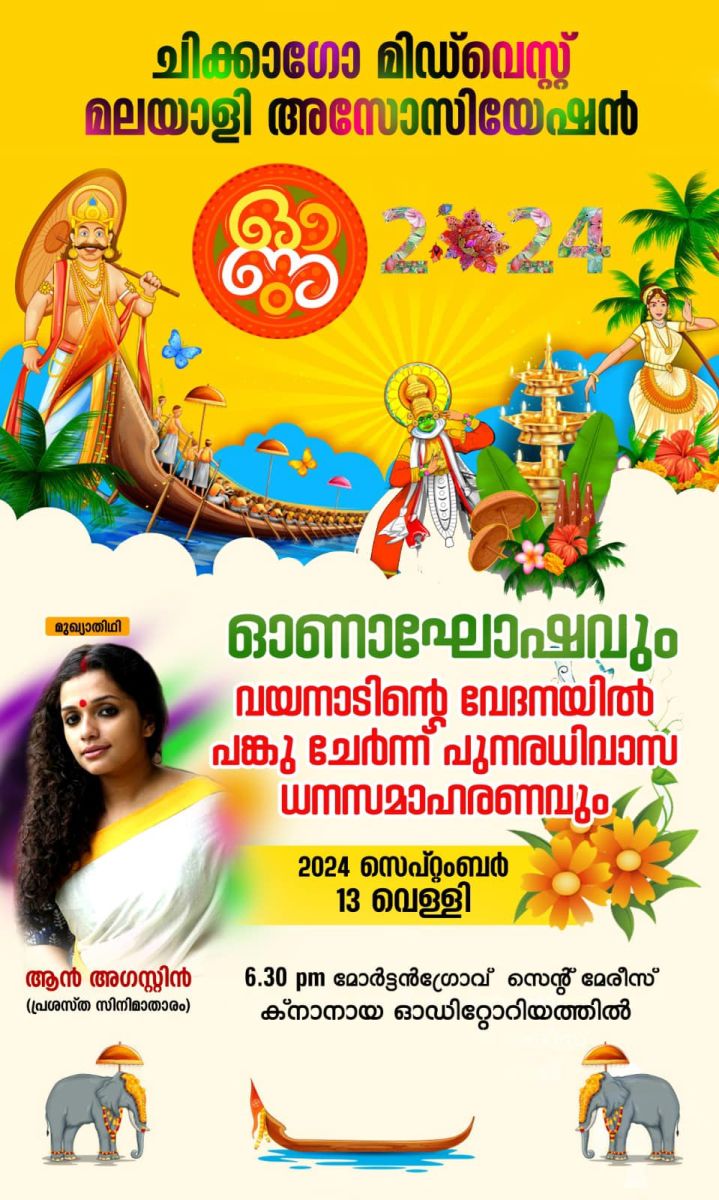 ചിക്കാഗോ:മിഡ് വെസ്റ്റ് മലയാളി അസോസിയേഷന് ഓഫ് അമേരിക്കയുടെ ഓണാഘോഷ പരിപാടികള് സെപ്റ്റംബര് 13-ന് വെള്ളിയാഴ്ച വൈകുന്നേരം 6.30 മുതല് മോര്ട്ടണ്ഗ്രോവ് സെന്റ് മേരീസ് ക്നാനായ ഓഡിറ്റോറിയത്തില് വെച്ച് നടത്തുന്നതാണ്. പ്രശസ്ത സിനിമാതാരം ആന് അഗസ്റ്റിന് ചടങ്ങില് മുഖ്യാതിഥിയായിരിക്കും. ഓണാഘോഷത്തോടൊപ്പം തന്നെ വയനാടിന്റെ വേദനയില് പങ്കുചേരുകയും പുനരധിവാസത്തിന് വേണ്ടിയുള്ള ധനസമാഹരണവും നടത്തുമെന്ന് പ്രസിഡണ്ട് റോയി നെടുംചിറ അറിയിച്ചു.
