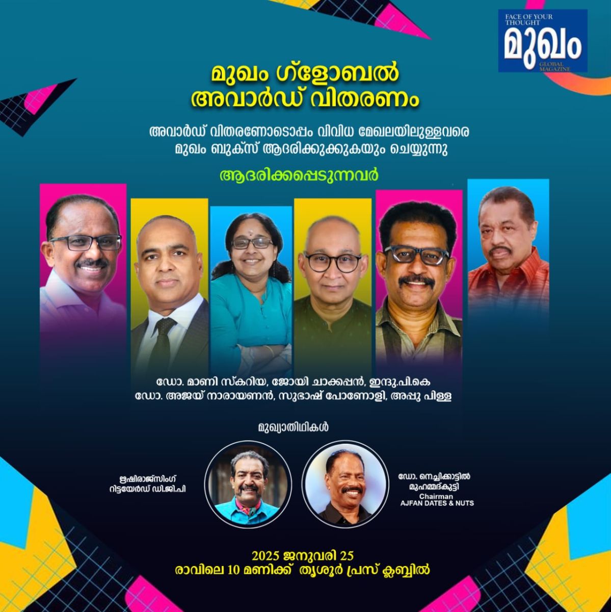 മലപ്പുറം:അക്ഷരങ്ങളിലൂടെ സാന്ത്വനം എന്ന സങ്കല്പവുമായി കോവിഡ് കാലത്ത് പ്രസിദ്ധീകരണമാരംഭിച്ച അതിജീവന മാസികയായ മുഖം ഗ്ലോബൽ മാസിക ഏർപ്പെടുത്തിയ 2023 -2024 ലെ ഗ്ലോബൽ പ്രതിഭാ പുരസ്കാരസമർപ്പണ വേദിയിൽ സമൂഹത്തിലെ വിവിധ മേഖലകളിൽ പ്രശസ്തരായ ആറ് വ്യക്തികളെ ആദരിക്കുകയും ചെയ്യുന്നു. പ്രവാസ മേഖലയിലും ,കേരളത്തിലും തങ്ങളുടെ പ്രവർത്തന മേഖലയിൽ വ്യക്തിമുദ്ര പതിപ്പിച്ചവരെയാണ് ആദരിക്കുകയെന്നു മുഖം ഗ്ലോബൽ മാസിക എഡിറ്റർ അനിൽ പെണ്ണുക്കര അറിയിച്ചു .
