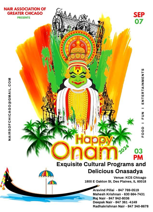 ഓണാഘോഷ പരിപാടികളില് പങ്കെടുക്കുവാന് ഏവരേയും സംഘാടകര് സ്വാഗതം ചെയ്യുന്നു. കൂടുതല് വിവരങ്ങള്ക്ക്: അരവിന്ദ് പിള്ള 647 769 0519, മഹേഷ് കൃഷ്ണന് 630 664 7431, രാജഗോപാലന് നായര് 847 942 8036 എന്നിവരുമായി ബന്ധപ്പെടുക.