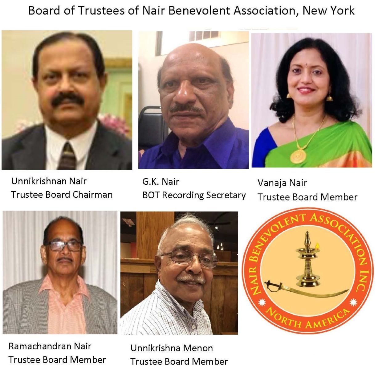 ന്യൂയോര്ക്ക്: ന്യൂയോർക്ക് നായർ ബനവലന്റ് അസോസിയേഷന്റെ 2024-25 പ്രവർത്തന വർഷത്തെ ട്രസ്റ്റീ ബോർഡ് ചുമതലയേറ്റു. ട്രസ്റ്റീ അംഗങ്ങൾ ചേർന്ന് ട്രസ്റ്റീ ബോർഡ് ചെയർമാനായി ന്യൂജേഴ്സിയിൽ നിന്നുള്ള ഉണ്ണിക്കൃഷ്ണൻ നായരെയും റിക്കോർഡിംഗ് സെക്രട്ടറിയായി റോക്ക്ലാന്റില് നിന്നുള്ള ജി. കെ. നായരെയും തെരഞ്ഞെടുത്തു. ഉണ്ണിക്കൃഷ്ണ മേനോൻ, രാമചന്ദ്രൻ നായർ, വനജ നായർ എന്നിവരാണ് മറ്റ് അംഗങ്ങൾ.
