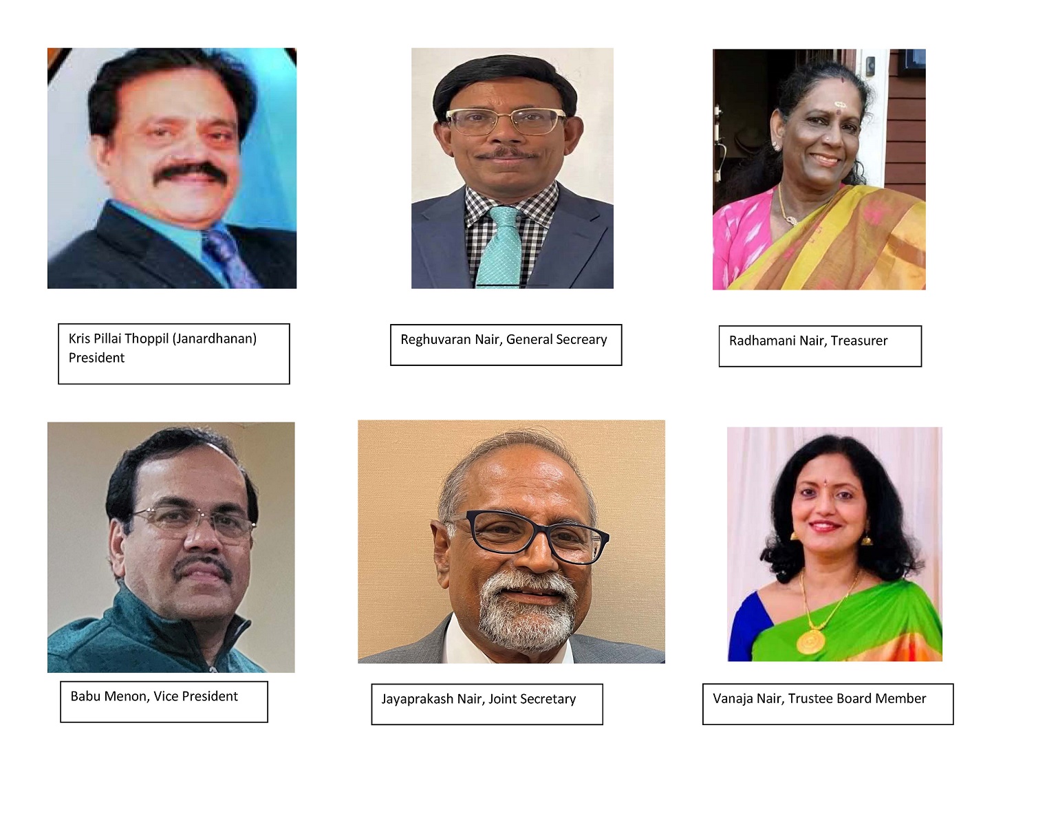 തുടർന്ന് ട്രസ്റ്റീ ബോർഡ് മെമ്പർമാരായ ജി.കെ.നായർ, ഉണ്ണിക്കൃഷ്ണൻ നായർ, രഘുനാഥൻ നായർ എന്നിവരുടെ നേതൃത്വത്തിൽ 2024-25 ലേക്കുള്ള ഭാരവാഹികളെ തെരഞ്ഞെടുത്തു. പ്രസിഡന്റ് ക്രിസ് പിള്ള തോപ്പിൽ (ജനാർദ്ദനൻ), വൈസ് പ്രസിഡന്റ് ബാബു മേനോൻ, ജനറൽ സെക്രട്ടറി രഘുവരൻ നായർ, ജോയിന്റ് സെക്രട്ടറി ജയപ്രകാശ് നായർ, ട്രഷറർ രാധാമണി നായർ എന്നിവരെയും, എക്സിക്യൂട്ടീവ് കമ്മിറ്റിയിലേക്ക് ഗോപിനാഥക്കുറുപ്പ്, മുരളീധര പണിക്കർ, നരേന്ദ്രനാഥൻ നായർ, രത്നമ്മ നായർ, സേതു മാധവൻ, ശ്രീധരൻ പിള്ള, വത്സല ഉണ്ണിക്കൃഷ്ണൻ നായർ എന്നിവരെയും, ഓഡിറ്റർമാരായി അപ്പുക്കുട്ടൻ പിള്ള, പ്രഭാകരൻ നായർ എന്നിവരെയും, ബോർഡ് ഓഫ് ട്രസ്റ്റിയിലേക്ക് വനജ നായരെയും എതിരില്ലാതെ തെരഞ്ഞെടുത്തു. വനജ നായരെക്കൂടാതെ ജി.കെ. നായർ, രാമചന്ദ്രൻ നായർ എന്നിവരാണ് ട്രസ്റ്റീ ബോർഡിലുള്ളത്. അപ്പുക്കുട്ടൻ നായർ എക്സ് ഒഫിഷ്യോ ആയി പ്രവർത്തിക്കും.