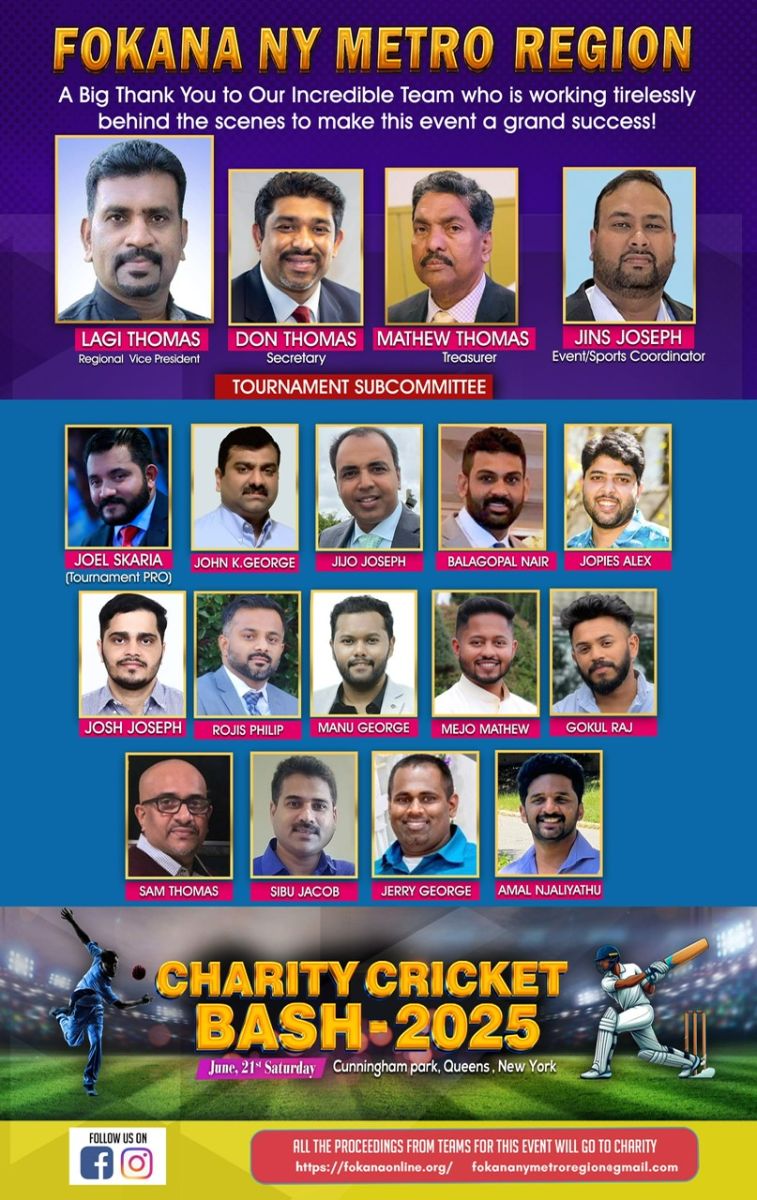 ന്യൂ യോര്ക്ക് : ഫൊക്കാന (ഫെഡറേഷൻ ഓഫ് കേരളാ അസ്സോസിയേഷൻസ് ഇൻ നോർത്ത് അമേരിക്ക ) ന്യൂ യോര്ക്ക് മെട്രോ റീജിയന്റെ പ്രഥമ ചാരിറ്റി ക്രിക്കറ്റ് ബാഷ് 2025 ടൂർണമെന്റ് ജൂൺ 21 ശനിയാഴ്ച കന്നിഹാം പാർക്ക്, ക്യൂൻസിൽ സംഘടിപ്പിക്കുന്നു. . ഇതിനായുള്ള ഒരുക്കങ്ങൾ ടൂർണമെന്റ് കോർഡിനേറ്റർ ജിൻസ് ജോസഫിന്റെ നേതൃത്വത്തിൽ പുരോഗമിക്കുന്നതായി റീജണൽ വൈസ് പ്രസിഡന്റ് ലാജി തോമസ് അറിയിച്ചു.