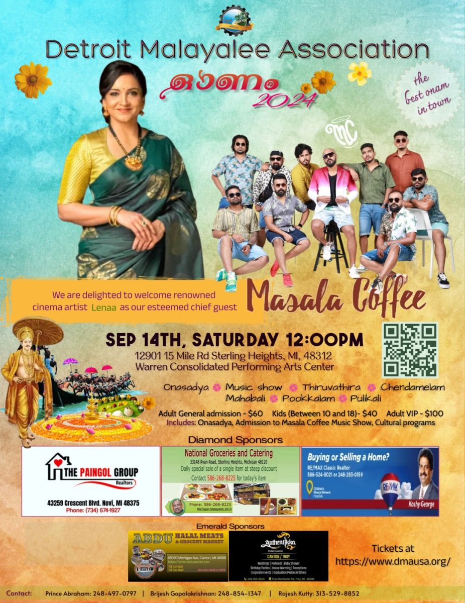 ഡിട്രോയിറ്റ്: മിഷിഗണിലെ ഏറ്റവും വലിയ മലയാളി സംഘടനയായ ഡിട്രോയിറ്റ് മലയാളി അസോസിയേഷന്റെ ഈ വർഷത്തെ ഓണാഘോഷം സെപ്റ്റംബർ 14ന്, വാറൻ കൺസോളിഡേറ്റഡ് പെർഫോമിങ് ആർട്സ് സെൻററിൽ വച്ച് നടക്കും. സുപ്രസിദ്ധ ദക്ഷിണേന്ത്യൻ ചലച്ചിത്ര താരമായ ലെന മുഖ്യാതിഥിയായ ഈ വർഷത്തെ ഓണാഘോഷങ്ങൾക്ക് വിപുലമായ ഒരുക്കങ്ങളാണ് നടത്തുന്നത്. സെപ്റ്റംബർ പതിനാലാം തീയതി ശനിയാഴ്ച ഉച്ചയ്ക്ക് 12 മണിക്ക് 24-ൽ പരം വിഭവങ്ങൾ ഉൾപ്പെട്ട ഓണസദ്യയോടെ ഓണാഘോഷങ്ങൾക്ക് തുടക്കം കുറിക്കും. വർഷങ്ങളായി ഓണസദ്യ വിളമ്പി നൽകുന്ന ഡി.എം.എ ഈ വർഷം ഒറിജിനൽ വാഴ ഇലയിൽ ആയിരിക്കും ഓണസദ്യ വിളമ്പുക. ഉച്ചയ്ക്കുശേഷം രണ്ടു മണിക്ക് ചെണ്ടമേളത്തിന്റെയും, താലപ്പൊലിയുടെയും, പുലികളിയുടെയും അകമ്പടിയോടെ മഹാബലിയെ വരവേൽക്കും തുടർന്ന് ഘോഷയാത്രയായി മഹാബലിയെ വേദിയിലേക്ക് ആനയിക്കും. സുപ്രസിദ്ധ ചലച്ചിത്ര താരം ലെന ഓണാഘോഷ പരിപാടികൾ ഉദ്ഘാടനം ചെയ്യും. തദവസരത്തിൽ ഡിഎംഎ എല്ലാവർഷവും നൽകി വരാറുള്ള എജുക്കേഷൻ സ്കോളർഷിപ്പ് അർഹരായവർക്ക് ഈ വർഷവും വിതരണം ചെയ്യും. തുടർന്ന് തിരുവാതിരയും മറ്റ് കലാ പരിപാടികളും നടക്കും. സുപ്രസിദ്ധ സൗത്ത് ഇൻഡ്യൻ ബാൻഡ് ആയ 'മസാല കോഫി' വേദിയിൽ മൂസിക് ഷോ അവതരിപ്പിക്കും.