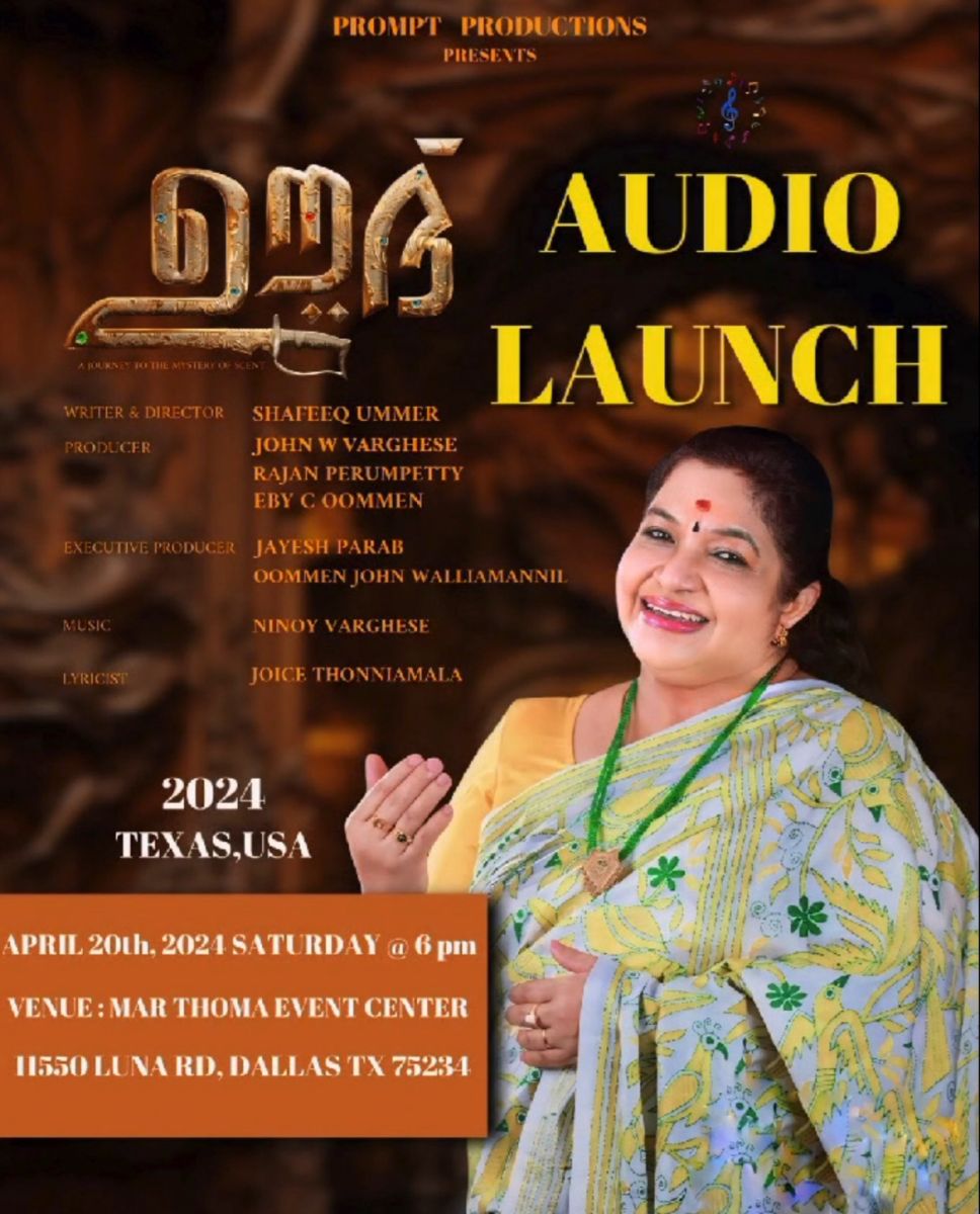 ഡാളസ് :"ഊദ്"എന്ന് നാമകരണം ചെയ്തിരിക്കുന്ന ചിത്രത്തിലെ മനോഹരമായ ഗാനം കെ എസ് ചിത്ര, ആലപിച്ചു ഓഡിയോ ലോഞ്ചിങ് നടത്തും