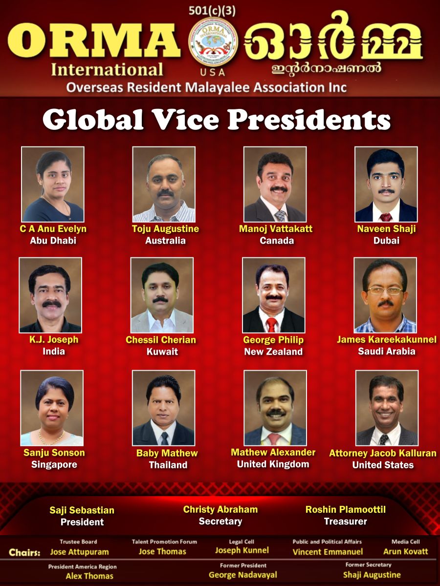 ഫിലാഡല്ഫിയ: രണ്ടായിരത്തി ഒന്പതില് ഫിലാഡല്ഫിയയില് തുടക്കം കുറിച്ച് ഇന്ന് ലോകത്തിന്റെ വിവിധ ഭാഗങ്ങളില് പടര്ന്നു പന്തലിച്ചിരിന്ന ഓര്മ ഇന്റര്നാഷണ ലിന് പുതിയ ഗ്ലോബല് വൈസ് പ്രെസിഡന്റുമാര്.
