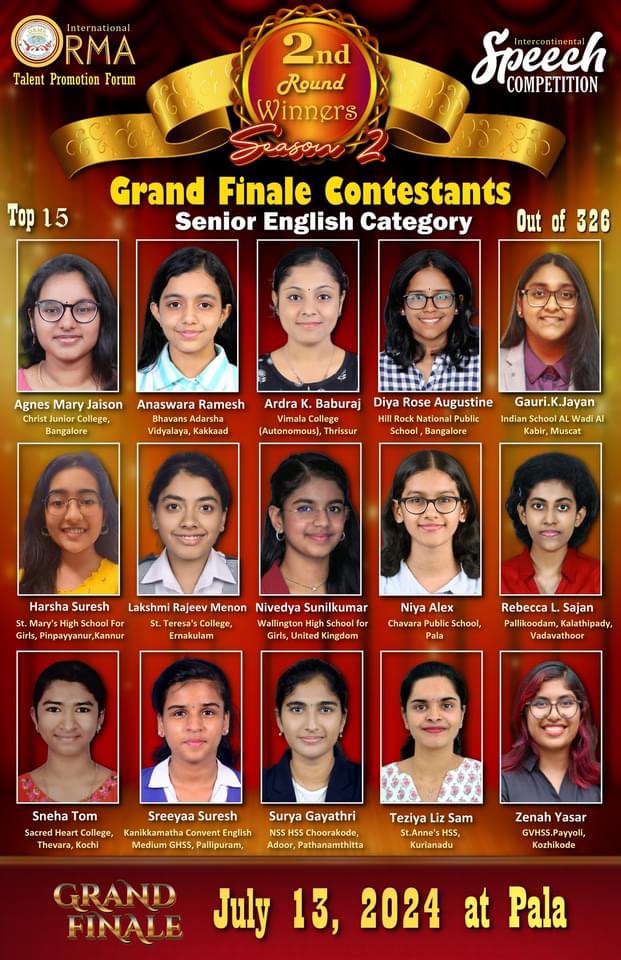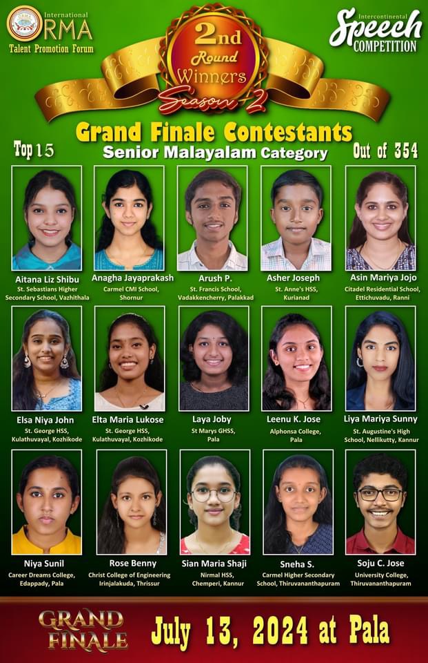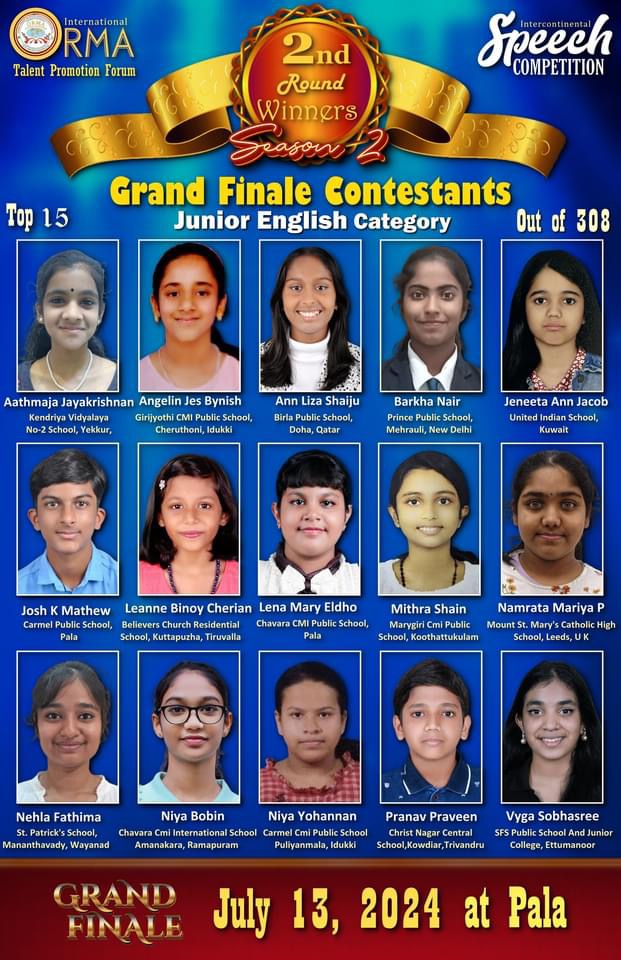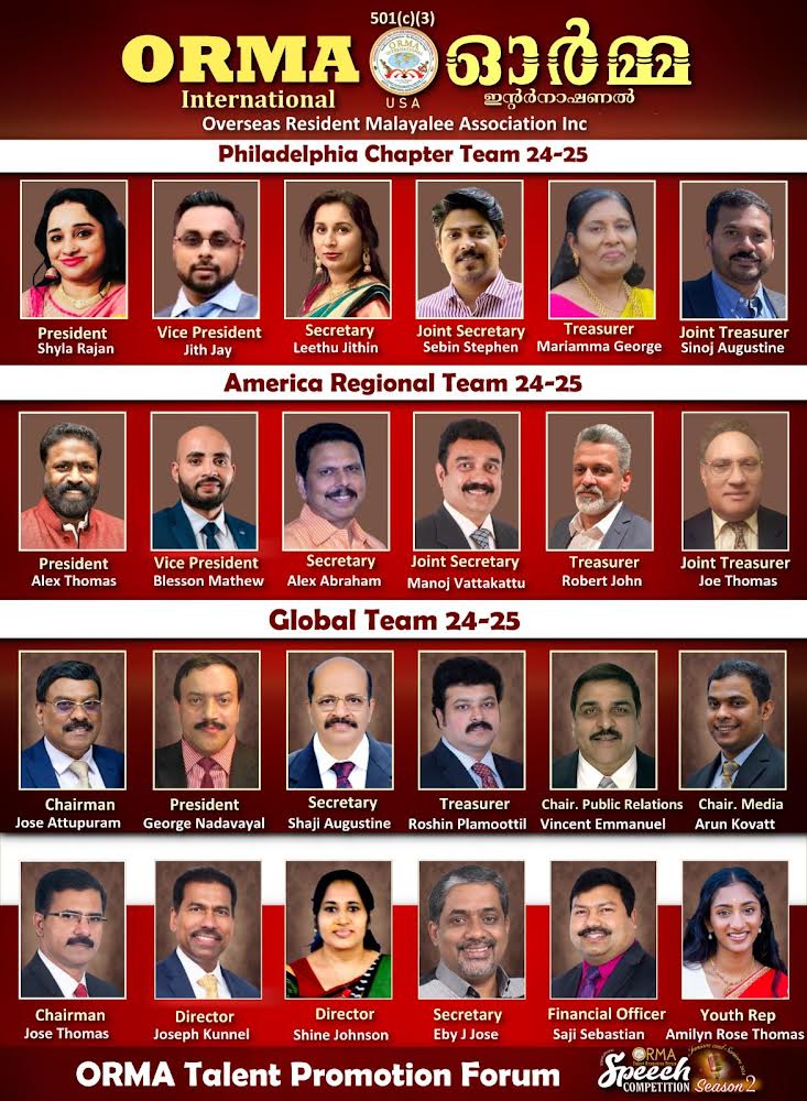 ഫിലഡൽഫിയ/ പാലാ: ഓർമാ ഇൻ്റർനാഷണൽ, സ്കൂൾ കോളജ് വിദ്യാർഥികൾക്കായി നടത്തുന്ന, അന്താരാഷ്ട്ര പ്രസംഗമത്സരത്തിൽ പങ്കെടുത്ത 1468 പ്രസംഗകരിൽ നിന്ന് 60 കുട്ടികൾ മികവിൻ്റെ അടിസ്ഥാനത്തിൽ ഫൈനൽ മത്സരത്തിന് അർഹത നേടിയെന്ന് ഓർമാ ഇൻ്റർനാഷണൽ ടാലൻ്റ് പ്രൊമോഷൻ ഫോറം ചെയർ ജോസ് തോമസ് അറിയിച്ചു. മലയാളം-ജൂനിയര്-സീനിയര്, ഇംഗ്ലീഷ്-ജൂനിയര്-സീനിയര് എന്നിങ്ങനെ നാല് വിഭാഗത്തില് നിന്നും 15 പേരെ വീതമാണ് തിരഞ്ഞെടുത്തിരിക്കുന്നത്.ജൂലൈ 12, 13 തീയതികളില് പാലായില് വെച്ചാണ് ഗ്രാന്ഡ് ഫിനാലെ നടക്കുന്നത്. " ഓർമാ ഒറേറ്റർ ഓഫ് ദി ഇയർ'24" അവാർഡ് ഉൾപ്പെടെ പത്തുലക്ഷം രൂപയുടെ സ മ്മാനങ്ങളാണ് സ്പോൺസർചെയ്തിരിക്കുന്നത്. ട്രസ്റ്റീ ബോഡ് ചെയർ ജോസ് ആറ്റുപുറം, പ്രസിഡൻ്റ് ജോർജ് നടവയൽ, ഷാജി അഗസ്റ്റിൻ, , റോഷൻ പ്ളാമൂട്ടിൽ, എബി ജോസ്, ഷൈൻ ജോൻസൺ, കുര്യാക്കോസ് മാണിവയലിൽ, വിൻസൻ്റ് ഇമ്മാനുവേൽ അറ്റേണി ജോസഫ് കുന്നേൽ, സജി സെബാസ്റ്റ്യൻ , ആലീസ് ജോസ്, അരുൺ കോവാട്ട്, അലക്സ് തോമസ്, ഷൈലാ രാജൻ അറ്റേണി ജോസഫ് കുന്നേൽ അലക്സ് അബ്രാഹം, സർജൻ്റ് ബ്ലസ്സൻ മാത്യൂ, റോബർട് ജോൺ അരീച്ചിറ, മനോജ് വട്ടക്കാട്ട്, ജൊ തോമസ്, എയ്മ്ലിൻ തോമസ്, ജിത് ജേ, ലീതൂ ജിതിൻ, സെബിൻ സ്റ്റീഫൻ, മറിയാമ്മ ജോർജ്, സിനോജ് അഗസ്റ്റിൻ വട്ടക്കാട്ട് , ജോയി തട്ടാർകുന്നേൽ, സേവ്യർ ആൻ്റണി എന്നിവർ സമ്മേളന ക്രമീകരണ ദൗത്യങ്ങൾ ചിട്ടപ്പെടുത്തുന്നു.