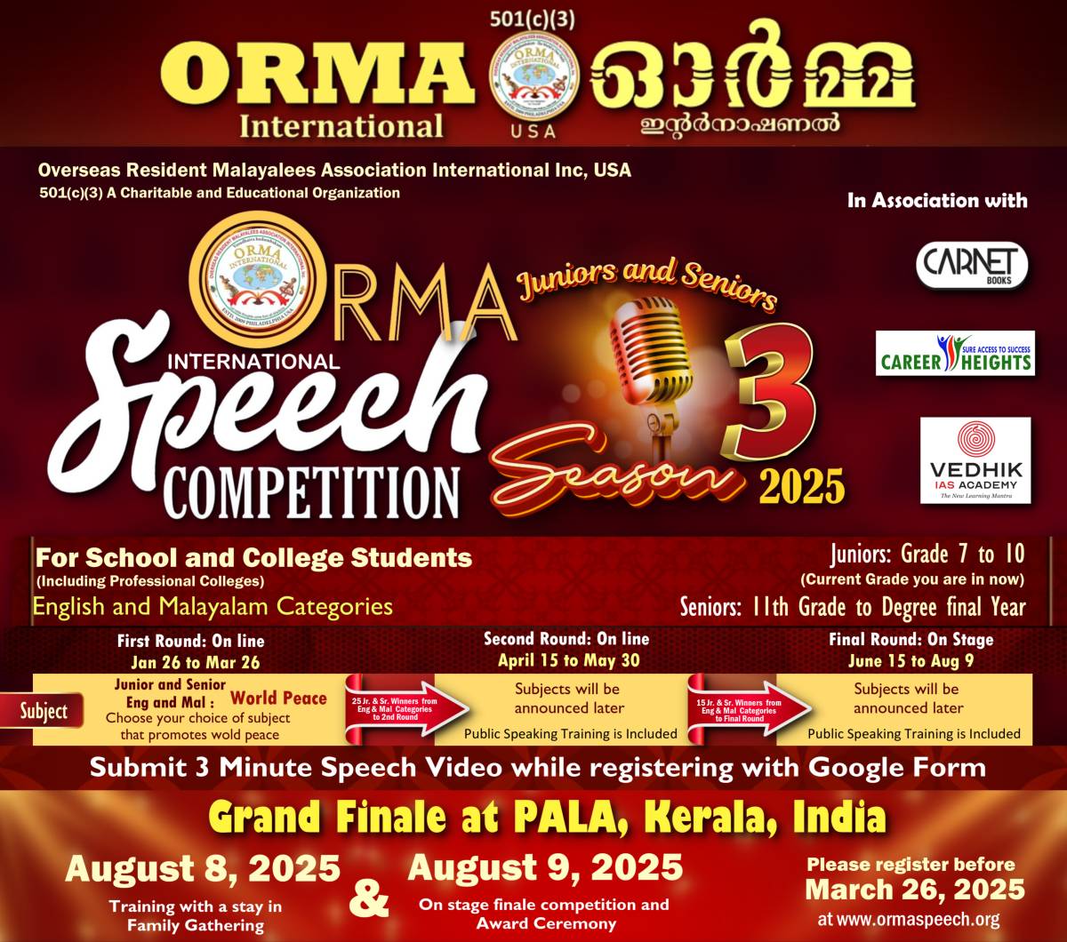 വേദിക് ഐഎഎസ് ട്രെയിനിംഗ് അക്കാദമി, കാര്നെറ്റ് ബുക്സ്, കരിയര് ഹൈറ്റ്സ് എന്നിവയുമായി സഹകരിച്ചാണ് ഓര്മ്മ സീസണ് 3 പ്രസംഗ മത്സരം സംഘടിപ്പിക്കുന്നത്. ഗ്രാന്ഡ് പ്രൈസായ 'ഓര്മാ ഒറേറ്റര് ഓഫ് ദി ഇയര്-2025 ' പ്രതിഭയ്ക്ക് അറ്റോണി ജോസഫ് കുന്നേല് സ്പോണ്സര് ചെയ്യുന്ന ഒരു ലക്ഷം രൂപ ക്യാഷ് അവാര്ഡും ട്രോഫിയും പ്രശസ്തിപത്രവും സമ്മാനം ലഭിക്കും.