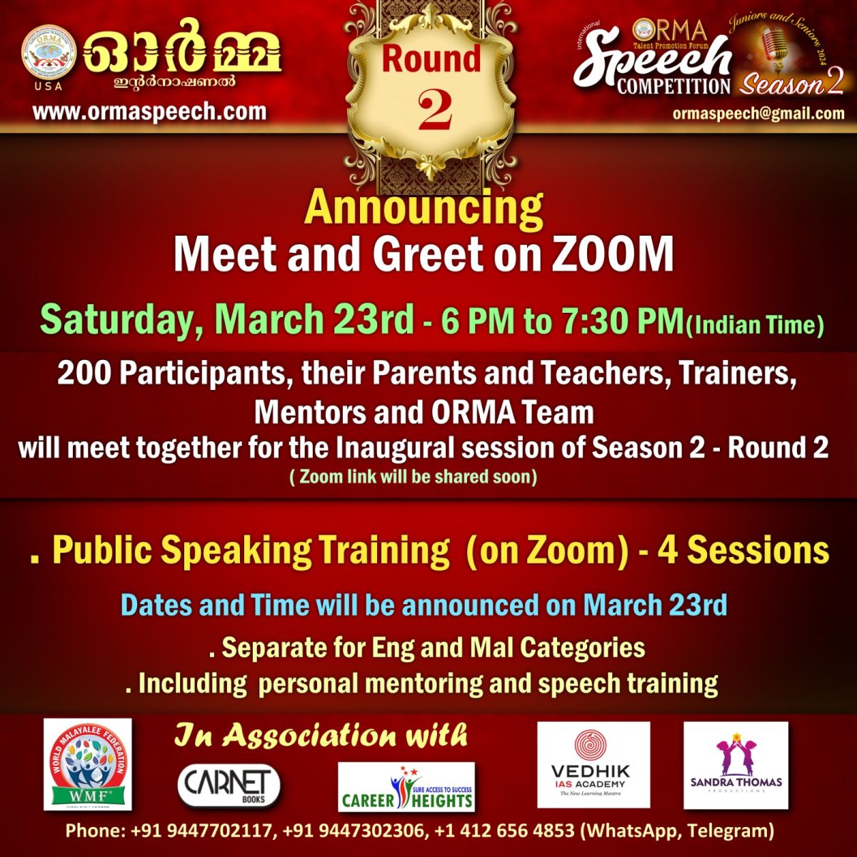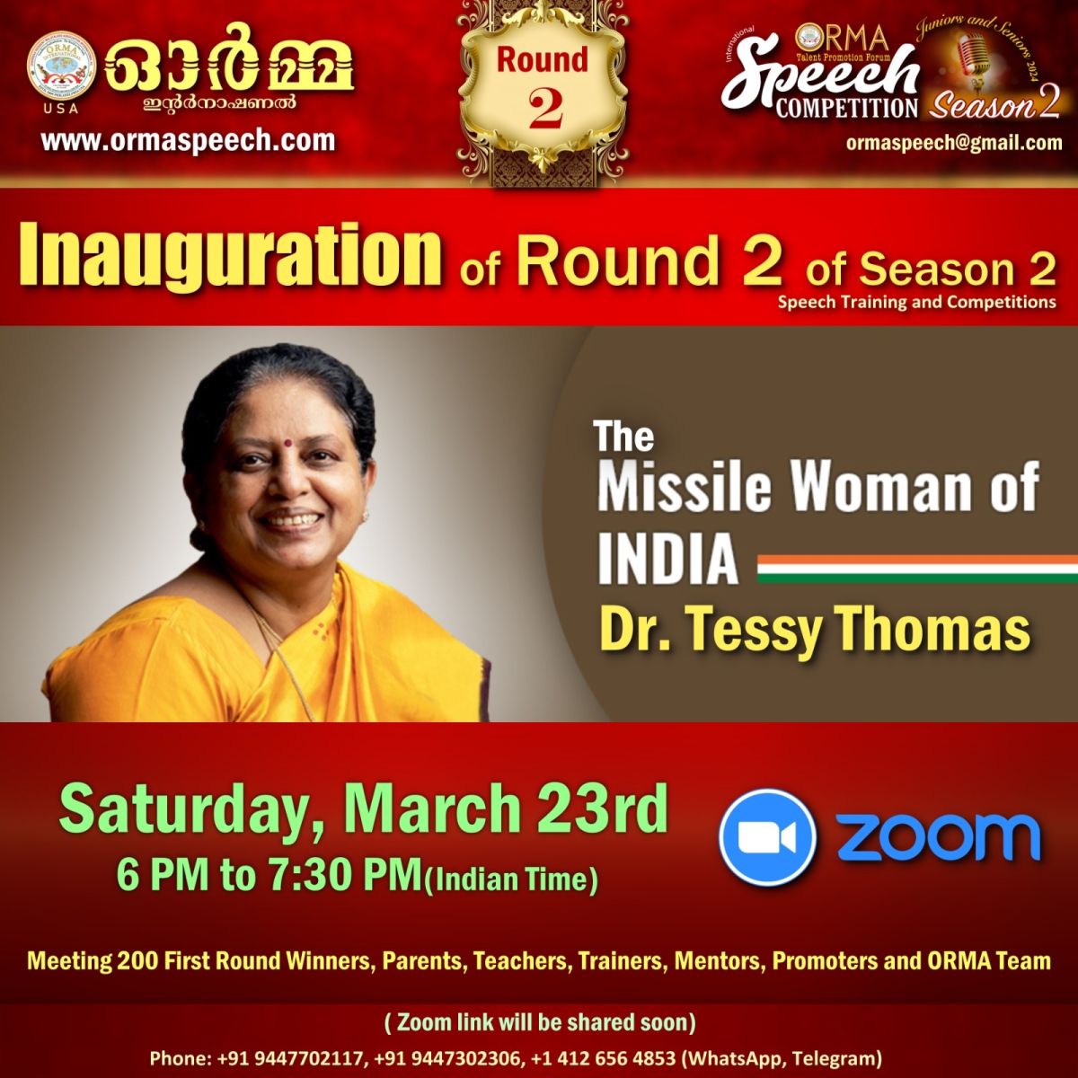 ഫിലഡൽഫിയ/പാലാ : ഓർമാ ഇൻ്റർനാഷണൽ സ്പീച് കോമ്പറ്റീഷൻ രണ്ടാം റൗണ്ട് , ഭാരത മിസ്സൈൽ വനിത, ഡോ. ടെസ്സി തോമസ്, മാർച്ച് 23 ശനിയാഴ്ച്ച, ഇന്ത്യൻ സമയം വൈകുന്നേരം 6 മണിയ്ക്ക് ഉദ്ഘാടനം ചെയ്യും. മത്സരാർത്ഥികളുടെ എണ്ണം കൊണ്ടും, ക്രമീകരണ നൂതനതകൾകൊണ്ടും, അറിയപ്പെട്ടിടത്തോളം ലോകത്തിലെ, ഇത്തരത്തിൽ "സൂപ്പർ ഡ്യൂപ്പറായ" പ്രസംഗമത്സര പരിശീലനഘട്ടത്തിൻ്റെ, ഭദ്രദീപം തെളിയ്ക്കലും, ഭാരതത്തിൻ്റെ മിസ്സൈൽ വനിത, ഡോ. ടെസ്സി തോമസ് നിർവഹിക്കും. വിധ രാജ്യങ്ങളിലെ വിദ്യാലയങ്ങളെ പ്രതിനിധീകരിച്ച് പങ്കെടുത്ത, ആയിരങ്ങളിൽ നിന്ന് മാറ്റു തെളിയിച്ച, 200 യുവവാഗ്മികളും, അവരുടെ അദ്ധ്യാപകരും മാതാപിതാക്കളും , ഓർമ്മാ ഇൻ്റർനാഷണൽ സ്പീച്ച് കോമ്പറ്റീഷൻ പ്രൊമോട്ടേഴ്സായി ലോകത്തിൻ്റെ നാനാ ഭാഗങ്ങളിൽ നിന്ന് സഹകരിക്കുന്ന സാമൂഹ്യ പ്രവർത്തകരും, ഈ സൂം മീറ്റിങ്ങിൽ പങ്കെടുക്കും. കൂടുതൽ വിവരങ്ങൾക്ക്: ജോസ് തോമസ് ( ഓർമാ ഇൻ്റർനാഷണൽ ടലൻ്റ് പ്രൊമോഷൻ ഫോറം ചെയർ):1- 412- 656-4853, എബി ജോസ് ( ഓർമാ ഇൻ്റർനാഷണൽ ടലൻ്റ് പ്രൊമോഷൻ ഫോറം സെക്രട്ടറി)91-944-770-2117, ജോസ് ആറ്റുപുറം (ഓർമാ ഇൻ്റർനാഷണൽ ട്രസ്റ്റീ ബോർഡ് ചെയർ): 1-267-231-4643, ഷാജീ അഗസ്റ്റിൻ ( ഓർമാ ഇൻ്റർനാഷണൽ ജനറൽ സെക്രട്ടറി) : 91-944-730-2306, ജോർജ് നടവയൽ ( ഓർമാ ഇൻ്റർനാഷണൽ പ്രസിഡൻ്റ്) 1-215-494-6420.