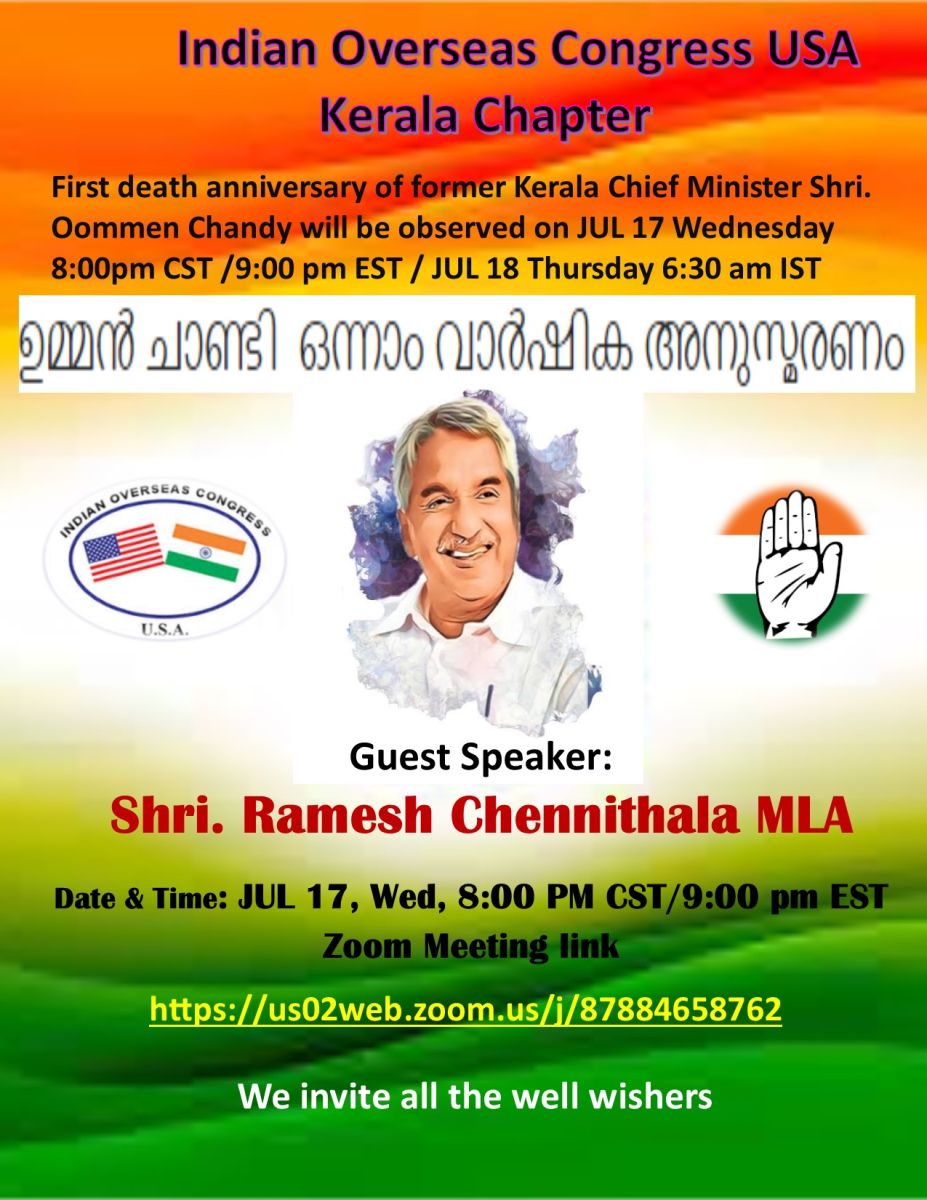 അദ്ദേഹം നമ്മെ വിട്ടു പിരിഞ്ഞിട്ട് ജൂലൈ 18-ാം തീയതി ഒരു വര്ഷം തികയുകയാണ്. അദ്ദേഹത്തിന്റെ ഓര്മ്മ പുതുക്കുന്നതിനായി ജൂലൈ 17-ാം തീയതി വൈകുന്നേരം (സെന്ട്രല് സമയം) എട്ടു മണിക്ക് സൂം മീറ്റിംഗ് നടത്തുന്നതാണ്. തദവസരത്തില് ബഹുമാന്യനായ രമേശ് ചെന്നിത്തല എംഎല്എ മുഖ്യാതിഥിയായിരിക്കും. കൂടാതെ മറ്റു രാഷ്ട്രീയ നേതാക്കളും പങ്കെടുത്തു സംസാരിക്കുന്നതാണ്.