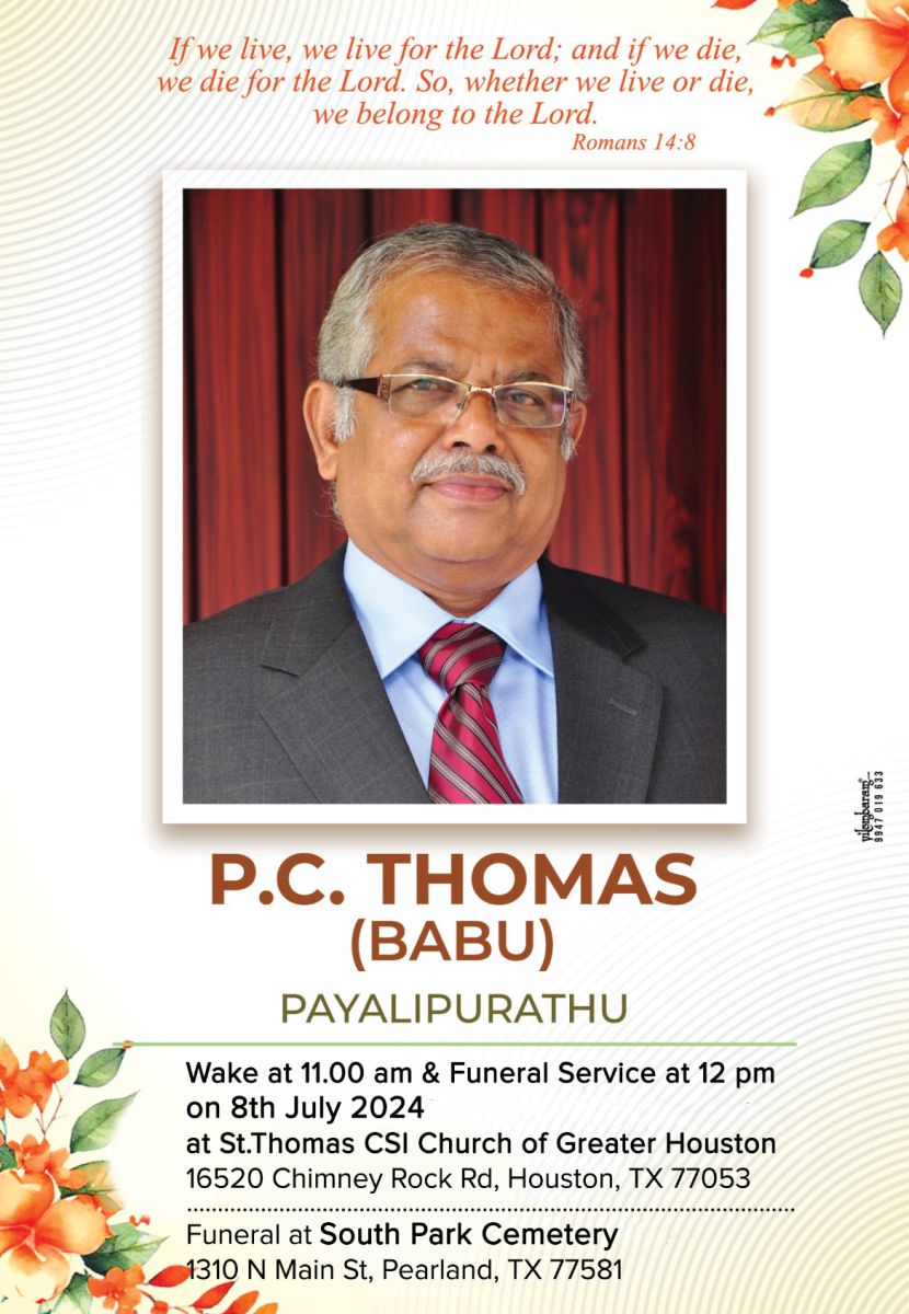 വേക്ക് & ഫ്യൂണറൽ സർവീസ് 2024 ജൂലൈ 8-ന് രാവിലെ 11.00 മുതൽ 12 മണി വരെ സെൻ്റ് തോമസ് സിഎസ്ഐ ചർച്ച് ഓഫ് ഗ്രേറ്റർ ഹൂസ്റ്റണിൽ 16520 ചിമ്മിനി റോക്ക് റോഡ്, ഹൂസ്റ്റൺ, TX 77053.
