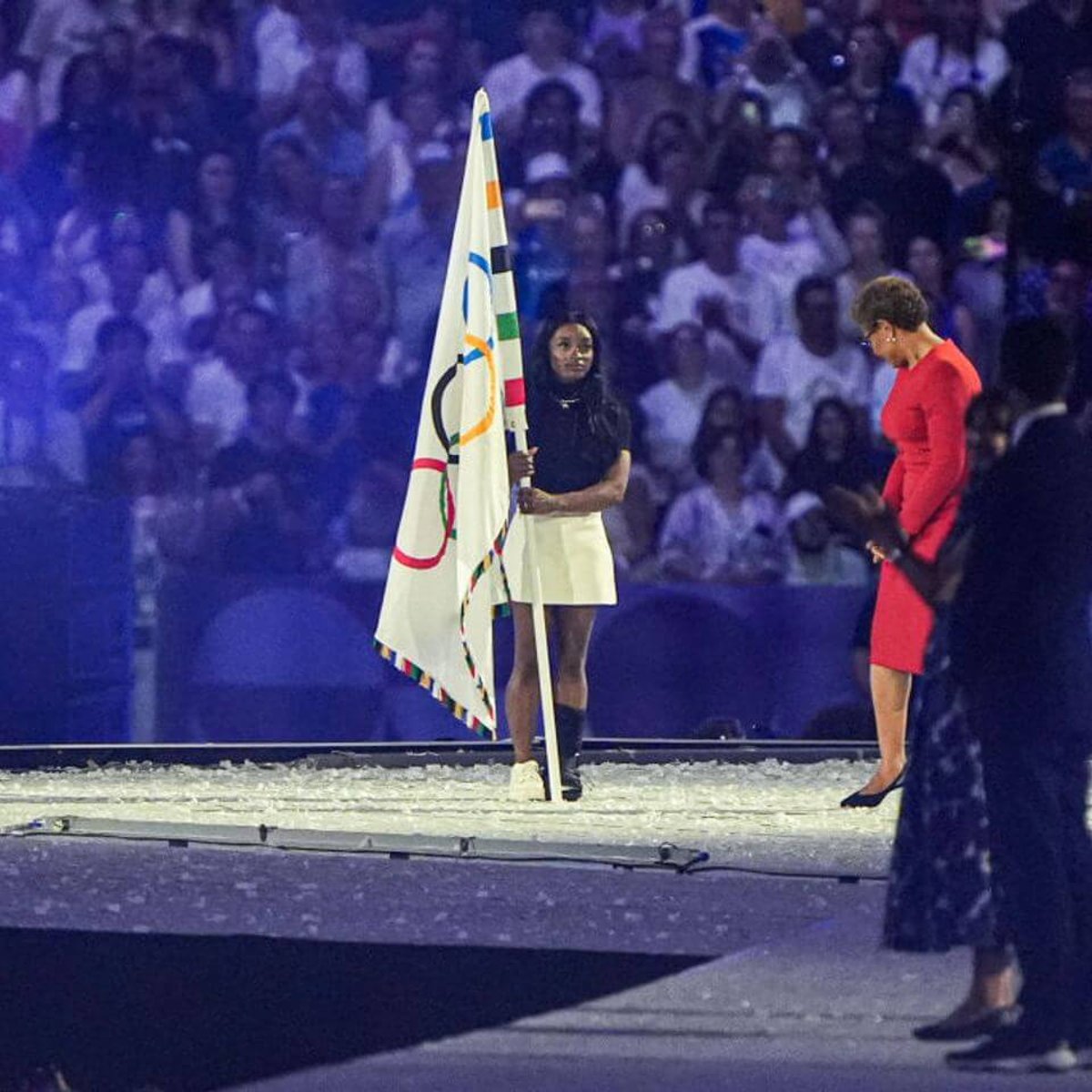 ഹോളിവുഡിന് അംഗീകാരമായി, നടൻ ടോം ക്രൂസ് താൻ പ്രശസ്തനായ ആക്ഷൻ ഫിലിം സീക്വൻസുകൾ പുനർനിർമ്മിച്ചുകൊണ്ട് പ്രധാന വേദിയിലെത്തി. ഒരു കേബിളും ഹാർനെസും ഉപയോഗിച്ച് സീലിംഗിൽ നിന്ന് സസ്പെൻഡ് ചെയ്ത ക്രൂസ് സ്റ്റേജിലേക്ക് ഇറങ്ങി, അവിടെ അമേരിക്കൻ ജിംനാസ്റ്റ് സിമോൺ ബൈൽസിൽ നിന്ന് ഒളിമ്പിക് പതാക ഏറ്റുവാങ്ങി. തുടർന്ന് അദ്ദേഹം ഒരു മോട്ടോർ സൈക്കിൾ കയറ്റി, പ്രതീകാത്മകമായി കാലിഫോർണിയ മെട്രോപോളിസിലേക്ക് പുറപ്പെട്ടു