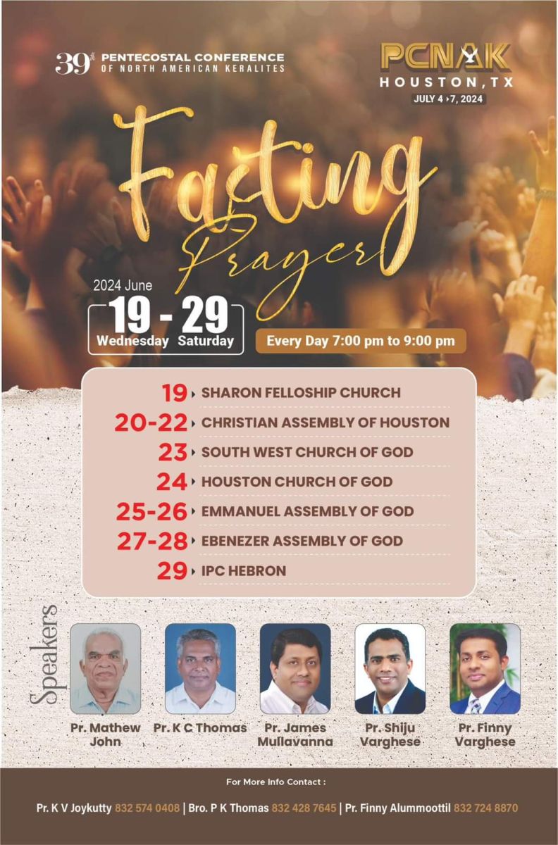 ഹൂസ്റ്റൺ: ജൂലൈ നാലു മുതൽ ഏഴ് വരെ ഹൂസ്റ്റൺ ജോർജ് ബ്രൗൺ കൺവെൻഷൻ സെൻട്രലിൽ വച്ച് നടത്തപ്പെടുന്ന വടക്കേ അമേരിക്കൻ മലയാളി പെന്തക്കോസ്ത് വിശ്വാസ സമൂഹത്തിന്റെ ദേശീയ കോൺഫ്രൻസായ പി.സി.എൻ.എ.കെ യുടെ വിജയകരമായ നടത്തിപ്പിനും, അനുഗ്രഹത്തിനു വേണ്ടിയും 19 ബുധൻ മുതൽ 29 ശനി വരെ ഹൂസ്റ്റൺ പട്ടണത്തിലെ വിവിധ പെന്തക്കോസ്ത് സഭകളിൽ വെച്ച് ഉപവാസ പ്രാർത്ഥനകൾ നടത്തപ്പെടും.