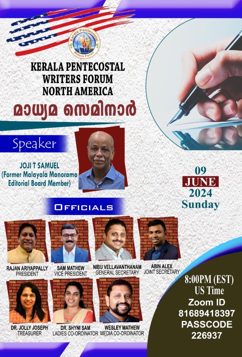 ന്യുയോർക്ക്: കേരള പെന്തക്കോസ്തൽ റൈറ്റേഴ്സ് ഫോറം ഓഫ് നോർത്ത് അമേരിക്കയുടെ നേതൃത്വത്തിൽ ജൂൺ 9 ന് ഞായറാഴ്ച മാധ്യമ സെമിനാർ നടത്തപ്പെടും . യുഎസ് ഈസ്റ്റേൺ സമയം വൈകിട്ട് എട്ടിന് സൂം പ്ലാറ്റ്ഫോമിൽ നടത്തപ്പെടുന്ന സെമിനാറിൽ മലയാള മനോരമ മുൻ എഡിറ്റർ ജോജി ടി. സാമുവൽ മുഖ്യ പ്രഭാഷണം നടത്തും. പ്രസിഡന്റ് രാജൻ ആര്യപ്പള്ളി അധ്യക്ഷത വഹിക്കും. മാധ്യമപ്രവർത്തനങ്ങളെ പറ്റി പഠിക്കുവാൻ ആഗ്രഹിക്കുന്ന ഏവർക്കും സെമിനാർ പ്രയോജനകരമാകുമെന്ന് സെക്രട്ടറി നിബു വെള്ളവന്താനം അറിയിച്ചു.
