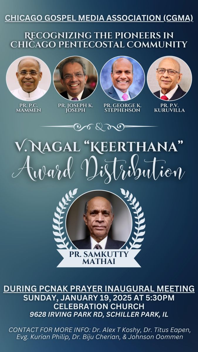 ഇതോടനുബന്ധിച്ച് കേരള ക്രൈസ്തവ സാഹിത്യ അക്കാദമി പ്രഖ്യാപിച്ച വി നാഗൽ കീർത്തന അവാർഡിന് അർഹനായ പാസ്റ്റർ സാംകുട്ടി മത്തായി ക്കുള്ള അവാർഡ് വിതരണവും ചിക്കാഗോയിലെ സീനിയർ മിനിസ്റ്റേഴ്സ് ആയ പാസ്റ്റർ ജോസഫ് കെ ജോസഫ് പാസ്റ്റർ പി സി മാമ്മൻ, പാസ്റ്റർ ജോർജ് കെ സ്റ്റീഫൻസൺ, പാസ്റ്റർ പി വി കുരുവിള എന്നിവരെ ആദരിക്കുന്നതിനുള്ള ചടങ്ങും ഉണ്ടായിരിക്കും. പ്രശസ്ത ക്രൈസ്തവ സാഹിത്യകാരൻ റവ ജോർജ് മാത്യു പുതുപ്പള്ളി അച്ഛൻ മുഖ്യ അതിഥി ആയിരിക്കും.