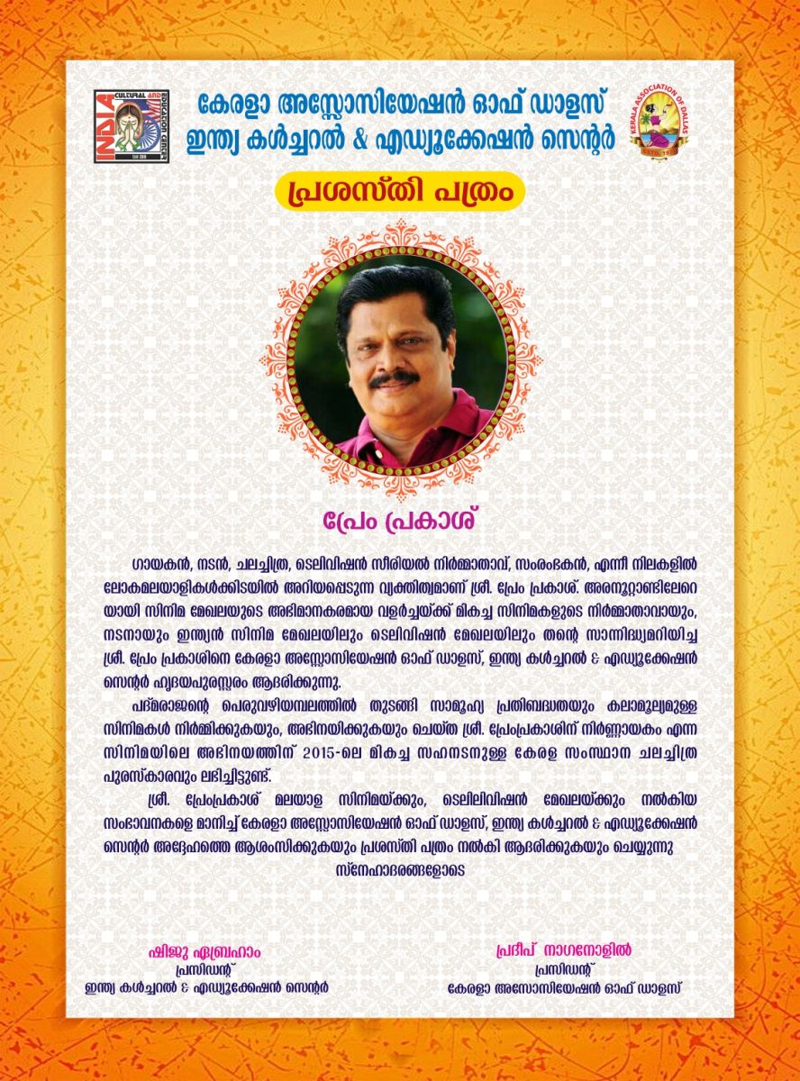 ഡാളസ്: പ്രശസ്ത ചലച്ചിത്ര നിർമ്മാതാവും നടനുമായ പ്രേം പ്രകാശ് ലൈഫ് ടൈം അച്ചീവ്മെൻ്റ് അവാർഡ് ഏറ്റുവാങ്ങി. ഇന്ത്യ കൾച്ചറൽ എഡ്യൂക്കേഷൻ സെൻ്ററും , കേരളാ അസ്സോസിയേഷൻ ഓഫ് ഡാളസും ചേർന്ന് നൽകിയ പുരസ്കാരം ഡാളസിലെ മലയാളി സമൂഹം നിറ കൈയ്യടികളോടെയാണ് സ്വീകരിച്ചത്. ഡാളസിൽ നടന്ന കേരളാ അസ്സോസിയേഷൻ്റെ ക്രിസ്തുമസ് പുതുവത്സര ആഘോഷ വേദിയിൽ വെച്ചാണ് പുരസ്കാരം നൽകിയത്.മലയാള സിനിമ സീരിയൽ രംഗത്തിന് നൽകിയ സമഗ്ര സംഭാവന പരിഗണിച്ചാണ് പ്രേം പ്രകാശിന് പുരസ്കാരം നൽകിയതെന്ന് ഇന്ത്യ കൾച്ചറൽ എഡ്യൂക്കേഷൻ പ്രസിഡൻ്റ് ഷിജു ഏബ്രഹാമും , ഡാളസ് കേരളാ അസോസിയേഷൻ പ്രസിഡൻ്റ് പ്രദീപ് നാഗലൂലിലും പറഞ്ഞു. ഇരുവരും ചേർന്നാണ് അദ്ദേഹത്തിന് പുരസ്കാരവും , പ്രശസ്തിപത്രവും, ക്യാഷ് അവാർഡും നൽകിയത്. ഗായകൻ , നടൻ, ചലച്ചിത്ര , ടെലിവിഷൻ സീരിയൽ നിർമ്മാതാവ് , സംരംഭകൻ എന്നീ നിലകളിൽ ശ്രദ്ധേയമായ വ്യക്തിത്വമാണ് പ്രേം പ്രകാശ്. അരനൂറ്റാണ്ടിലേറെയായി സിനിമ മേഖലയുടെ അഭിമാനകരമായ വളർച്ചയ്ക്ക് മികച്ച സിനിമകളുടെ നിർമ്മാതാവായും, നടനായും ഇന്ത്യൻ സിനിമ മേഖലയിലും , ടെലിവിഷൻ മേഖലയിലും തൻ്റെ സാന്നിദ്ധ്യമറിയിച്ച പ്രേം പ്രകാശിനെ അമേരിക്കൻ മലയാളി സമൂഹം ആദരിച്ച നിമിഷം കൂടിയായി ഈ പുരസ്കാര വിതരണ ചടങ്ങ്.