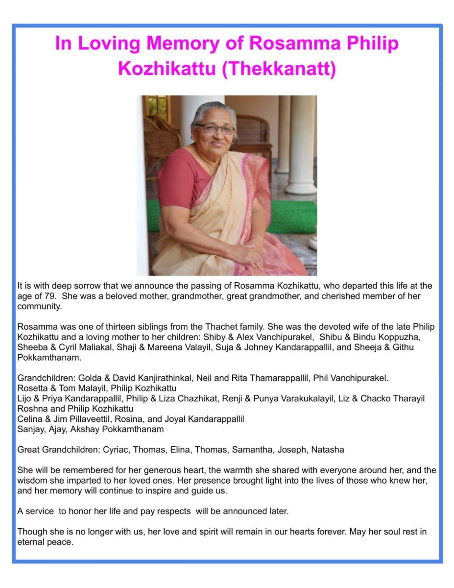 മക്കൾ : ഷൈബി വഞ്ചിപുരക്കൽ ( അറ്റ്ലാൻ്റാ ) , ഷിബു കോഴികാട്ട് ( അറ്റ്ലാൻ്റാ ) , ഷീബ മാളിയേക്കൽ ( അറ്റ്ലാൻ്റാ) , ഷാജി കോഴികാട്ട് ( അറ്റ്ലാൻ്റാ ) , സുജ കണ്ടാരപ്പള്ളിൽ ( ഫ്ലോറിഡ ) , ഷീജ പൊക്കംതാനം ( ഡിട്രോയിറ്റ് ).