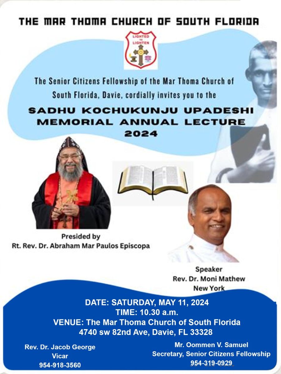ഫ്ലോറിഡാ: മൂത്താംമ്പക്കൽ സാധു കൊച്ചുകുഞ്ഞ് ഉപദേശി മെമ്മോറിയൽ വാർഷിക പ്രഭാഷണ പരമ്പര സൗത്ത് ഫ്ലോറിഡാ മാർത്തോമ്മാ ഇടവക സീനിയർ സിറ്റിസൺ ഫെലോഷിപ്പിന്റെ നേതൃത്വത്തിൽ മെയ് 11 ശനിയാഴ്ച രാവിലെ 10.30 ന് മാർത്തോമ്മാ സഭയുടെ നോർത്ത് അമേരിക്ക ഭദ്രാസനാധ്യക്ഷൻ ബിഷപ് ഡോ. എബ്രഹാം മാർ പൗലോസ് ഉത്ഘാടനം ചെയ്യും.