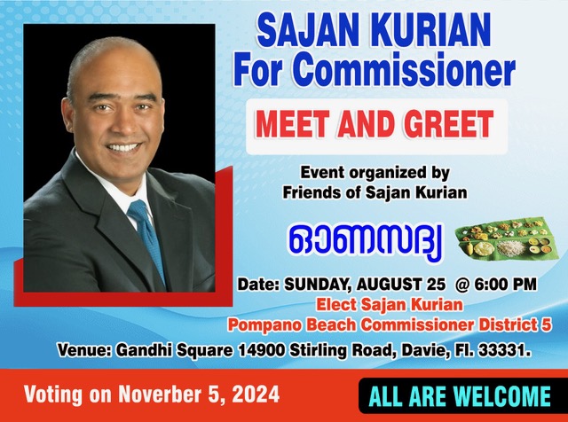 Davie, Florida: സൗത്ത് ഫ്ലോറിഡാ മലയാളകളുടെ ഇടയിൽ പ്രമുഖനായ ഡോ. സാജൻ കുര്യൻ പാമ്പനോ ബീച് സിറ്റി കമ്മിഷണറായി മത്സരിക്കുന്നു. നവംബർ 5-നുള്ള പൊതു തെരഞ്ഞെടുപ്പിലാണ് സാജൻ മറ്റു രണ്ടു സ്ഥാനാർഥികളോടൊപ്പം വാശിയേരിയ ഈ തെരഞ്ഞെടുപ്പിൽ മാറ്റുരക്കുന്നത്.