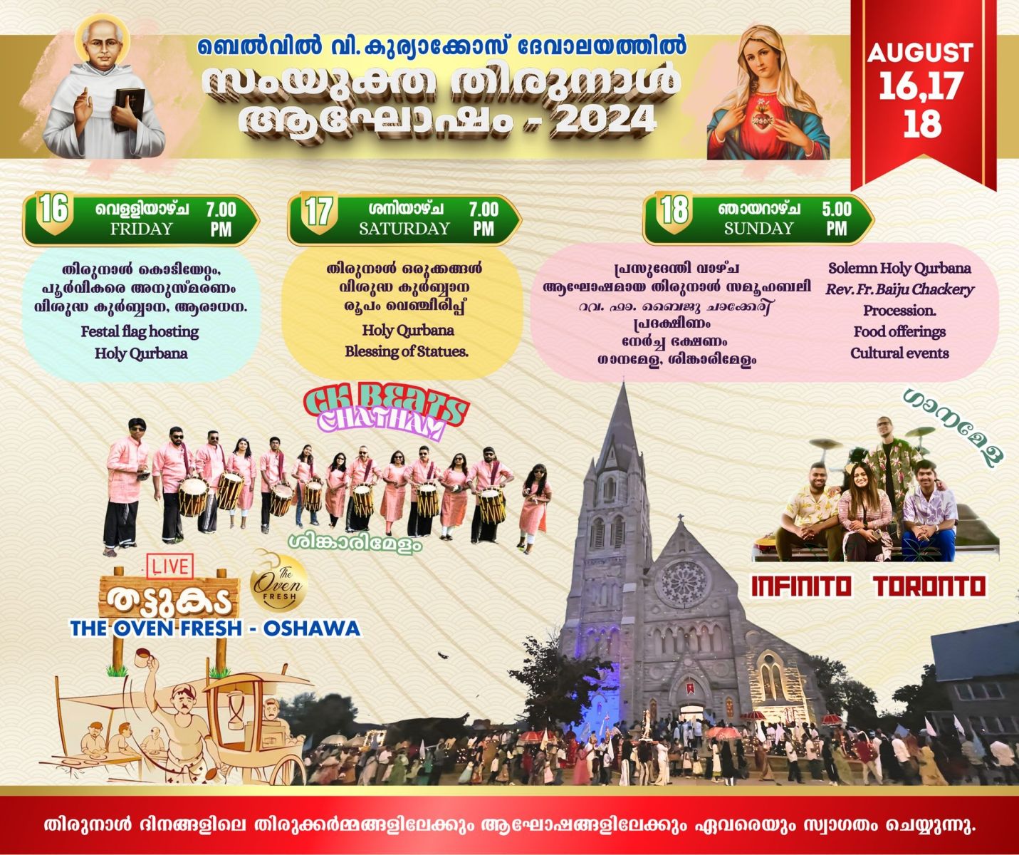 പെരുന്നാളിനോടനുബന്ധിച്ച് സി കെ ബീറ്റ്സ് ചാത്തം നയിക്കുന്ന ശിങ്കാരിമേളം, ഓഷോവ ഓവൻ ഫ്രഷ് ഒരുക്കുന്ന പ്രത്യേക ലൈവ് തട്ടുകടയും, തുടർന്ന് ഇൻഫിനിറ്റി ടൊറന്റോ അവതരിപ്പിക്കുന്ന മനസ്സിനും കുളിർമയേകുന്ന ഗാനമേളയും ഉണ്ടായിരിക്കുന്നതാണ്.