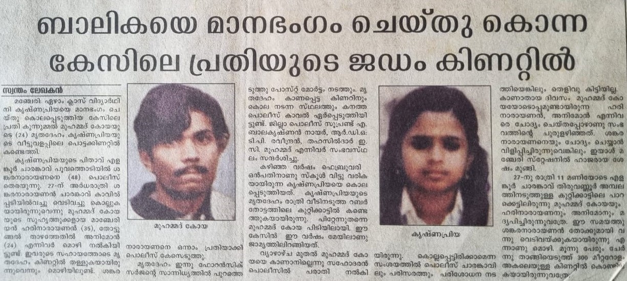 2001 ഫെബ്രുവരി ഒന്പതിനാണ് ശങ്കരനാരായണന്റെ ഇളയമകള് പതിമുന്നു വയസുകാരി കൃഷ്ണപ്രീയ കൊല്ലപ്പെട്ടത്. സ്കൂള് വിട്ടു വരുന്ന വഴി അയല്വാസിയായ എളങ്കൂര് ചാരങ്കാവ് കുന്നുമ്മല് മുഹമ്മദ് കോയ ക്രൂരമായി ബലാത്സംഗം ചെയ്തു. ആ 24 വയസുകാരന്റെ ക്രൂരതയില് കൃഷ്ണപ്രീയയുടെ ജീവന് നഷ്ടമായി. മകള് വീട്ടിലെത്താതിരുന്നതിനെ തുടര്ന്ന് അന്വേഷിച്ച് ഇറങ്ങിയ ആ പിതാവിന് ലഭിച്ചത് സമീപത്തെ റബര് തോട്ടത്തിലെ കുറ്റിക്കാട്ടില് നിന്നും പിച്ചി ചീന്തിയ നിലയിലുള്ള മൃതദേഹമായിരുന്നു.