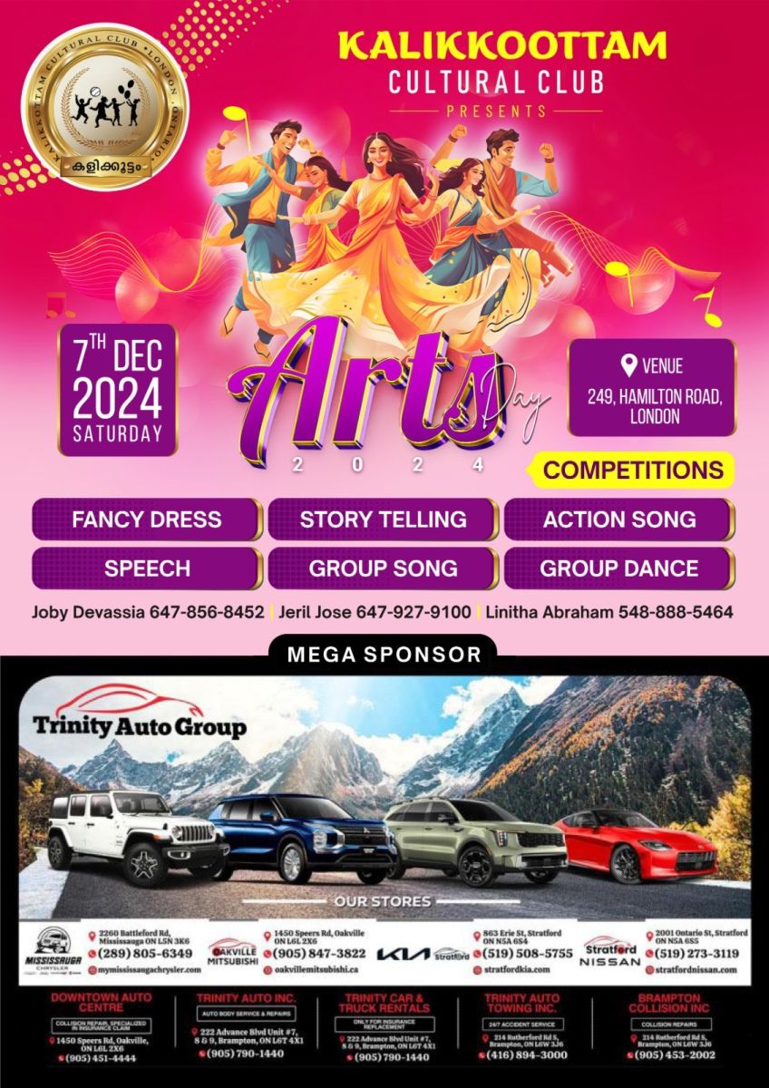ലണ്ടൻ മലയാളികൾക്കായുള്ള ഈ കലോത്സവം സ്പോൺസർ ചെയ്യുന്നത് ബോബൻ ജെയിംസ് (ട്രിനിറ്റി ഗ്രൂപ്പ്) ആണ്. ഒന്റാരിയോ ഓട്ടോമൊബൈൽ ഇൻഡസ്ട്രിയിൽ വളരെപ്പെട്ടെന്ന് തന്നെ തങ്ങളുടേതായ ഒരു സ്ഥാനം കണ്ടെത്തിയ ട്രിനിറ്റി ഗ്രൂപ്പിന്റെ ചില സെലെക്ടഡ് മോഡലുകൾ അതിശയിപ്പിക്കുന്ന വിലക്കിഴിവിലും, ലൈഫ്ടൈം ഓഫറുകളുമായാണ് നമ്മെ കാത്തിരിക്കുന്നത്. സ്ട്രാറ്റ്ഫോർഡ് നിസ്സാൻ, സ്ട്രാറ്റ്ഫോർഡ് കിയ, ഓക് വില്ലി മിത്സുബിഷി, മിസ്സിസാഗാ ക്രിസ്ലർ, ജീപ്പ്, ഡോഡ്ജ് തുടങ്ങി ഒന്റാരിയോ ആകെ പടർന്ന് പന്തലിച്ച ട്രിനിറ്റി ഗ്രൂപ്പ് നിങ്ങളുടെ എല്ലാവിധ വാഹന ആവശ്യങ്ങൾക്കും അനുയോജ്യമായ ഒരു ഉത്തരം ആയിരിക്കും.