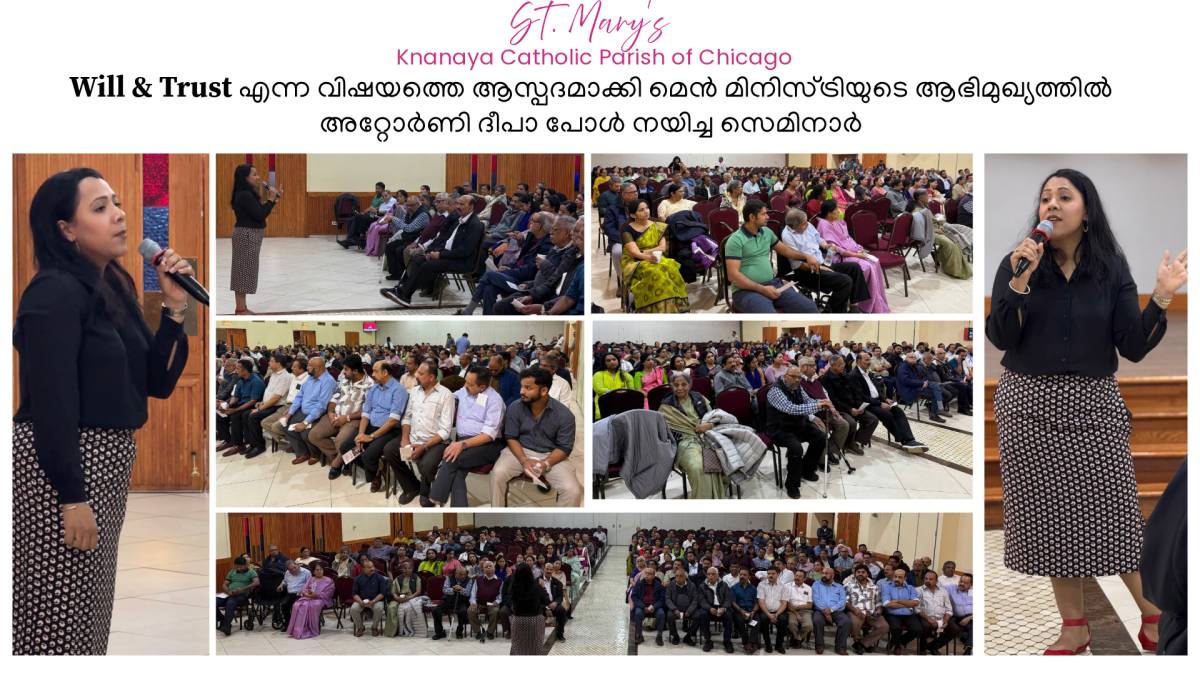ചിക്കാഗോ: ചിക്കാഗോ സെന്റ് മേരീസ് ക്നാനായ കത്തോലിക്കാ ഇടവകയിലെ മെൻ മിനിസ്ട്രിയുടെ ആഭിമുഖ്യത്തിൽ സെമിനാർ സംഘടിപ്പിച്ചു. അമേരിക്കയിലെ പ്രത്യേക ജീവിത സാഹചര്യങ്ങളുടെയും നിയമപരമായ നടപടിക്രമങ്ങളുടെയും പശ്ചാത്തലത്തിൽ, വിൽപത്രം തായ്യാറാക്കുന്നതിന്റെ നടപടിക്രമങ്ങളും വിൽപത്രങ്ങളുടെ കുറവുകളും, ആ കുറവുകൾ മറികടക്കാനുപകരിക്കുന്ന ട്രസ്റ്റ് രൂപീകരണത്തെ സംബന്ധിച്ചുമുള്ള വിവരങ്ങൾ ഉൾപ്പെടുത്തിക്കൊണ്ടാണ് Will & Trust എന്ന വിഷയത്തെ ആസ്പദമാക്കി സെമിനാർ സംഘടിപ്പിച്ചത്. ചിക്കാഗോയിലെ മലയാളി സമൂഹത്തിൽ അറിയപ്പെടുന്ന വക്കീലായ അറ്റോർണി ദീപാ പോൾ സെമിനാർ നയിക്കുകയും, പങ്കെടുത്തവരുടെ സംശയങ്ങൾക്ക് മറുപടി നൽകുകയും ചെയ്തു. സാധാരണഗതിയിൽ തയ്യാറാക്കുന്ന വില്പത്രങ്ങൾ നടപ്പിൽ വരുത്തുവാൻ, മരിച്ചയാളിന്റെ കാലശേഷം ഉണ്ടായേക്കാവുന്ന നിയമപരമായ കാലതാമസവും കോടതിവഴിയായി ഇത് നടപ്പിലാക്കേണ്ടിവരുമ്പോൾ ഉണ്ടായേക്കാവുന്ന ചിലവും സെമിനാറിൽ ചർച്ചാവിഷയമായി. ഇതിന് പരിഹാരമായി തയ്യാറാക്കുന്ന പല വിധത്തിലുള്ള ട്രസ്റ്റുകളെ സംബന്ധിച്ചുള്ള വിവരങ്ങളും സെമിനാറിൽ അറ്റോർണി ദീപാ പോൾ പങ്കുവച്ചു. മെൻ മിനിസ്ട്രി കോർഡിനേറ്റർ പോൾസൺ കുളങ്ങര സ്വാഗതം ആശംസിച്ചു. സിബി കൈതക്കത്തൊട്ടിയിൽ നന്ദിപ്രകാശനം നടത്തി. വികാരി ഫാ. സിജു മുടക്കോടിയിൽ, പാരിഷ് സെക്രട്ടറി സിസ്റ്റാർ ഷാലോം എന്നിവരോടൊപ്പം കൈക്കാരന്മാരായ സാബു കട്ടപ്പുറം, ബിനു പൂത്തുറ, ലൂക്കാച്ചൻ പൂഴിക്കുന്നേൽ, ജോർജ്ജ് മറ്റത്തിപ്പറമ്പിൽ, നിബിൻ വെട്ടിക്കാട്ട്, സെക്രട്ടറി സണ്ണി മേലേടം, പിആർഒ അനിൽ മറ്റത്തികുന്നേൽ എന്നിവർ സെമിനാറിന്റെ സജ്ജീകരണങ്ങൾക്ക് നേതൃത്വം നൽകി.