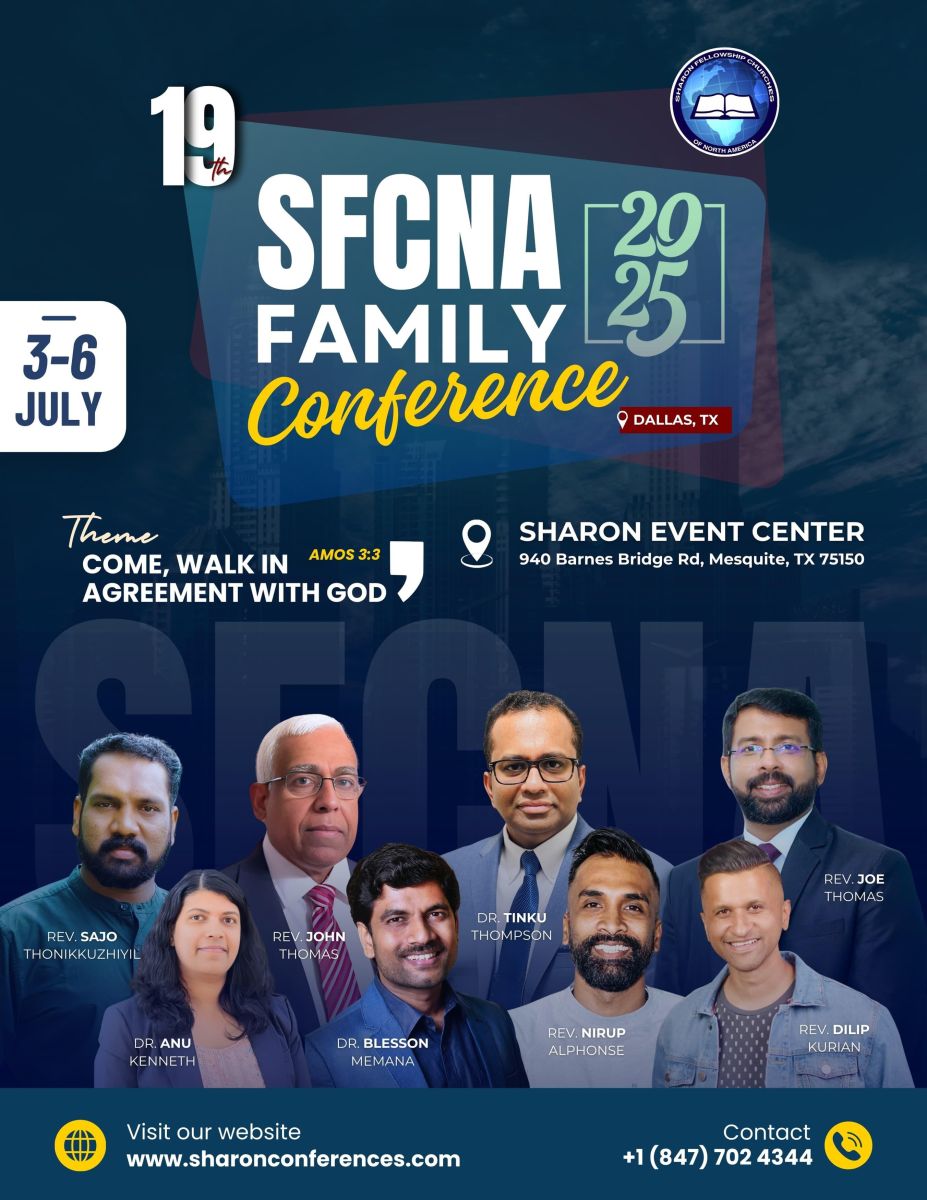 ഡാളസ്, ടെക്സാസ്: ശാരോൻ ഫെല്ലോഷിപ്പ് ചർച്ചസ് ഓഫ് നോർത്ത് അമേരിക്ക (SFCNA) 19മത് ഫാമിലി കോൺഫറൻസ് 2025 ജൂലൈ 3 മുതൽ 6 വരെ ഡാളസിലെ ശാരോൻ ഇവന്റ് സെന്ററിൽ (940 ബാർണസ് ബ്രിഡ്ജ് റോഡ്, മെസ്ക്വൈറ്റ്, TX 75150) നടക്കും.