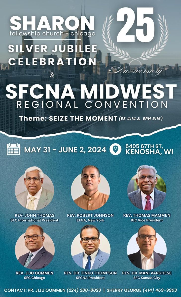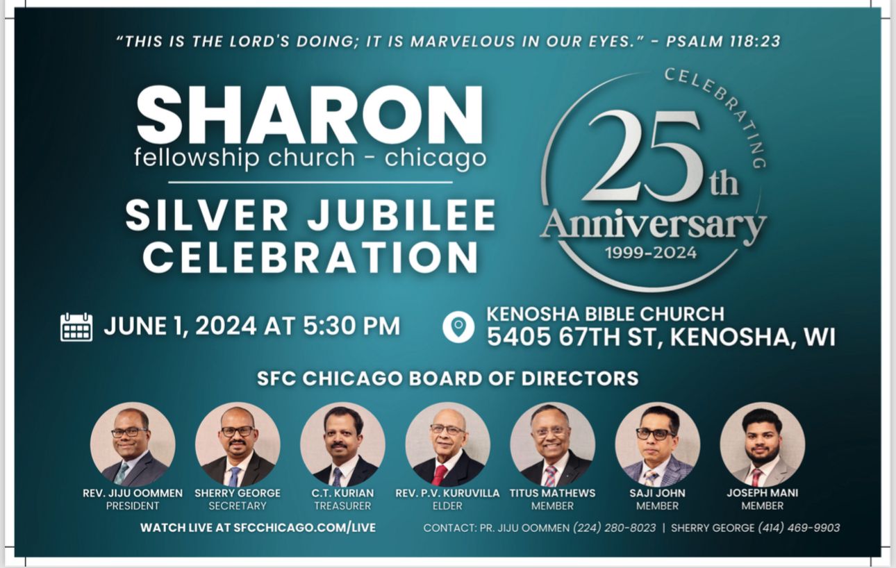 ചിക്കാഗോയിൽ ശാരോൻ ഫെല്ലോഷിപ്പ് ചർച്ചിന്റെ പ്രവർത്തനം ആരംഭിച്ചിട്ട് 25 വർഷം പൂർത്തിയാക്കുന്നതിന്റെ ഭാഗമായി പ്രത്യേക സ്തോത്ര ശുശ്രൂഷ സമ്മേളനം ജൂൺ 1 ശനിയാഴ്ച വൈകിട്ടു അഞ്ചര മണിക്ക് നടക്കും. ഈ സമ്മേളനത്തിൽ കെനോഷാ സിറ്റി മേയർ ഡേവിഡ് ബോഗ്ഡോള ഉൾപ്പെടെയുള്ള വിശിഷ്ട അതിഥികൾ പങ്കെടുക്കും. സിൽവർ ജൂബിലി തീം സോങ് ക്വയർ അവതരിപ്പിക്കും. സഭയുടെ ചരിത്രം അടങ്ങിയ സുവനീർ ഈ സമ്മേളനത്തിൽ പ്രകാശനം ചെയ്യും. റവ. ജിജു ഉമ്മൻ (പ്രസിഡന്റ് ), ഷെറി കെ. ജോർജ് (സെക്രട്ടറി), ജെയിംസ് ഉമ്മൻ (പ്രോഗ്രാം കോർഡിനേറ്റർ) എന്നിവരുടെയും ചർച്ച് ബോർഡിന്റെയും നേതൃത്വത്തിൽ വിവിധ കമ്മിറ്റികൾ സമ്മേളനത്തിന്റെ സുഗമമായ നടത്തിപ്പിനായി പ്രവർത്തിച്ചു വരുന്നു.