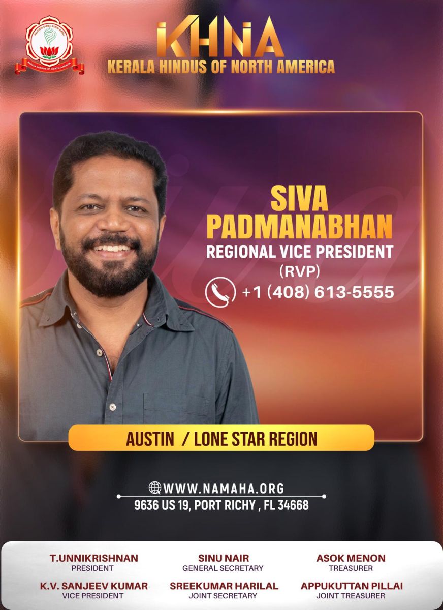 ഓസ്റ്റിൻ: നോർത്ത് അമേരിക്കയിലെ മലയാളി ഹിന്ദുക്കളുടെ ദേശീയ സംഘടനയായ Kerala Hindus of North America (KHNA)യുടെ ലോൺ സ്റ്റാർ-ഓസ്റ്റിൻ റീജിയണൽ വൈസ് പ്രസിഡന്റായി (RVP) ശിവ പദ്മനാഭനെ നിയമിച്ചു. ടെക്സാസിലെ ഓസ്റ്റിൻ ഉൾപ്പെടുന്ന ലോൺ സ്റ്റാർ മേഖലയിൽ സംഘടനാ പ്രവർത്തനങ്ങൾ ഏകോപിപ്പിക്കുകയും സാമൂഹിക–സാംസ്കാരിക പ്രവർത്തനങ്ങൾക്ക് നേതൃത്വം നൽകുകയും ചെയ്യുന്നതാണ് അദ്ദേഹത്തിന്റെ പ്രധാന ചുമതല.