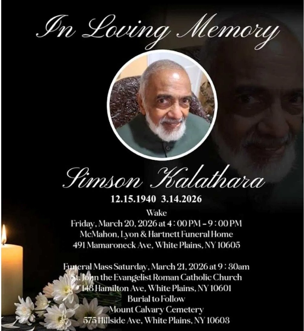 സിംസൺ കളത്ര വൈക്കത്ത് ചെമ്പ് എന്ന ഗ്രാമത്തിൽ 12.15.1940ൽ ജനനം, അമേരിക്കയിലെ വൈറ്റ്പ്ലെയിൻസിൽ 03.14.2026ൽ മരണം. ഏതാണ്ട് 85, വയസ്സുവരെ ജീവിച്ചിരുന്ന അദ്ദേഹത്തിൻറെ വേർപാട് സ്വന്തം കുടുംബാംഗങ്ങളെയും ബന്ധുമിത്രാദികളെയും അമേരിക്കയിലെ മറ്റ് അനവധി മലയാളികളെയും കണ്ണീരിലാഴ്ത്തി. സംഭവബഹുലമായുള്ള അദ്ദേഹത്തിൻറെ ജീവിതം, പ്രത്യേകിച്ച് ഇവിടത്തെ അനവധി മലയാളികൾക്ക് ഒരു വെളിച്ചവും വഴികാട്ടിയും ആയിരുന്നു. അദ്ദേഹത്തിൻറെ റസ്റ്റോറൻറ് സ്ഥാപനം വഴി അനവധി പേർക്ക് പല ഘട്ടങ്ങളിലായി അദ്ദേഹം തൊഴിൽ നൽകിയിട്ടുണ്ട്.