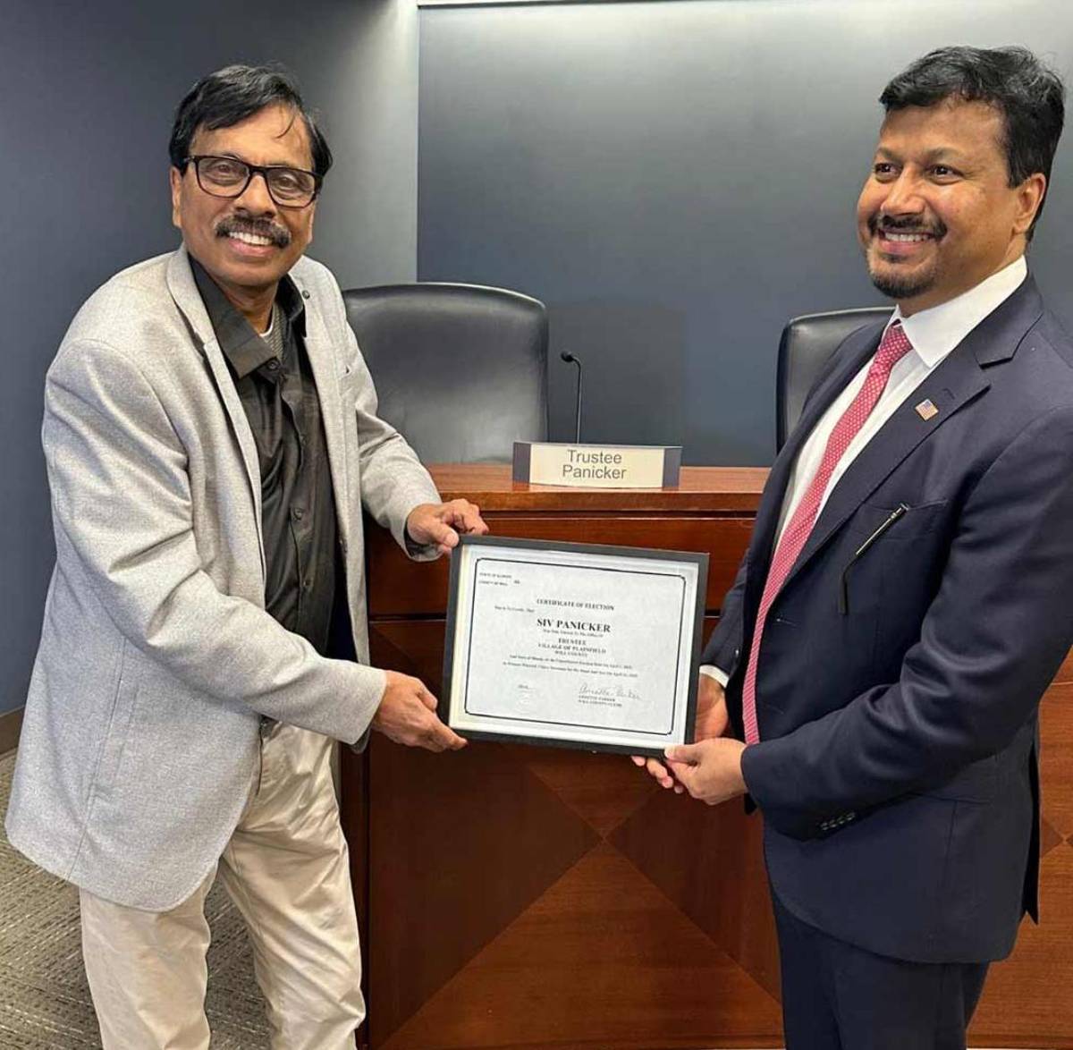 Plainfield, Illinois.Siv Panicker was sworn in as trustee on May 5, 2025, at Plainfield Village Hall in front of a large gathering of friends, families, and village residents. Other trustees sworn in were Venessa Sula and Tom Ruane (incumbent). John Argoudelis (incumbent) was sworn in as Mayor. The oath was administered by Michelle Gibas, Village Clerk. Following the ceremony, he attended his first board meeting.