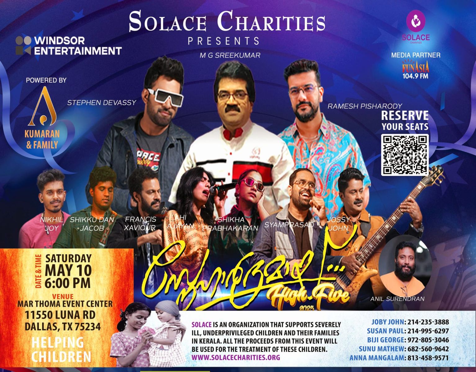തൃശൂർ ആസ്ഥാനമായി 17 വർഷമായി സൊലസ് പ്രവർത്തിക്കുന്നു. കേരളത്തിലെ വിവിധ ജില്ലകളിലായി 10 കേന്ദ്രങ്ങളിലും, അമേരിക്കയിലെ വിവിധ സ്റ്റേറ്റ്കളിലും സൊലസ് സജീവ പ്രവർത്തനം നടത്തി വരുന്നു.18 വയസ്സിന് താഴെയുള്ള 6,000 ത്തിൽ പരം വരുന്ന കുട്ടികൾക്കും അവരുടെ കുടുംബങ്ങൾക്കുമായി നിലനിൽക്കുകയാണ് സൊലസ് ഇന്നും. സൊലസിന്റെ പ്രവർത്തനങ്ങൾ സമൂഹത്തിന്റെ ശ്രദ്ധയിൽ കൊണ്ടുവരുന്നതിനും സഹായധന സമാഹരണം നടത്തുന്നതിനും വേണ്ടി "സ്നേഹാർദ്രമായ്" High Five 2025 എന്ന പേരിൽ സംഗീത സന്ധ്യ സംഘടിപ്പിക്കുന്നു. സംഗീത സന്ധ്യ മെയ് 10ന് ശനിയാഴ്ച വൈകിട്ട് 6 മണിക്ക് ഡാളസിലുള്ള മാർത്തോമാ ഇവന്റ് സെൻ്ററിൽ വെച്ചാണ് നടത്തപ്പെടുന്നത്.പ്രശസ്ത പിന്നണി ഗായകൻ എം ജി ശ്രീകുമാർ, സ്റ്റീഫൻ ദേവസി, ശിഖ പ്രഭാകർ, അഹി അജയൻ എന്നിവർ ചേർന്ന് ലൈവ് ഓർക്ക്സ്ട്രയുടെ അകമ്പടിയോടു കൂടിയുള്ള സംഗീത സന്ധ്യയും. രമേശ് പിഷാരടിയുടെ നേതൃത്വത്തിലുള്ള കോമഡി ഷോയും അരങ്ങേറും.ഈ സംഗീത വിരുന്നിലേക്കും സൊലസിന്റെ പ്രവർത്തനങ്ങളിലേക്കും