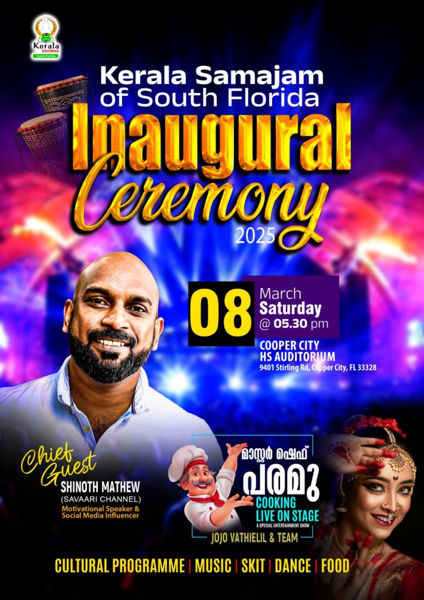 ഫ്ലോറിഡ : സൗത്ത് ഫ്ളോറിഡയിലെ പ്രമുഖ മലയാളി സംഘടനയായ കേരള സമാജത്തിന്റെ 2025 വർഷത്തെ ഔപചാരികമായ ഉത്ഘാടന സമ്മേളനം മാർച്ച് 8 ശനിയാഴ്ച വൈകിട്ട് കൂപ്പർ സിറ്റി ഹൈസ്കൂൾ ഓഡിറ്റോറിയത്തിൽ വെച്ച് നടത്തുവാൻ തീരുമാനിച്ചു. വൈകുന്നേരം 5:30 ന് വിഭവ സമൃദ്ധമായ അത്താഴ വിരുന്നോടുകൂടി ആരംഭിക്കുന്ന പ്രസ്തുത സമ്മേളനം സമാജം പ്രസിഡണ്ട് ബിജു ജോൺ ഉത്ഘാടനം ചെയ്യും. പ്രശസ്ത മലയാളി മോട്ടിവേഷണൽ സ്പീക്കറും സോഷ്യൽ മീഡിയ ഇൻഫ്ലുവൻസറുമായ ഷിനോദ് മാത്യു ( സവാരി യുട്യൂബ് ചാനൽ ) ചടങ്ങിന്റെ വിശിഷ്ടാതിഥിയായി പങ്കെടുത്തുകൊണ്ട് മുഖ്യ പ്രഭാഷണം നിർവ്വഹിക്കും.