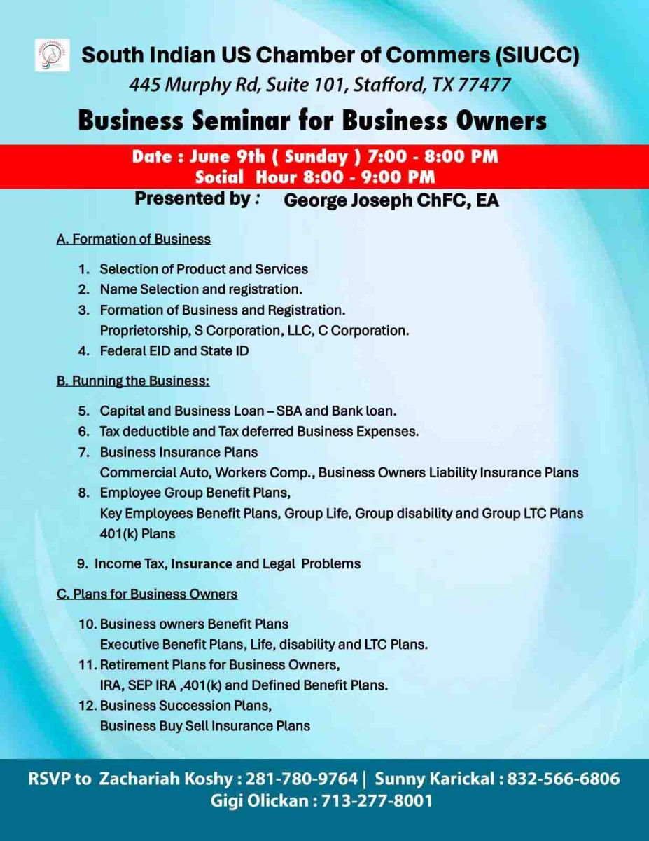 അമേരിക്കയിലെ ഇൻഷുറൻസ് രംഗത്ത് ദീർഘവർഷങ്ങളുടെ അനുഭവ സമ്പത്തും പരിചയ സമ്പന്നനുമായ പ്രമുഖ ഇൻഷുറൻസ് ലീഡർ ജോർജ് ജോസഫാണ് സെമിനാര് നയിയ്ക്കുന്നത് .ചേംബർ പ്രസിഡണ്ട് സക്കറിയ കോശി അദ്ധ്യക്ഷത വഹിക്കും.