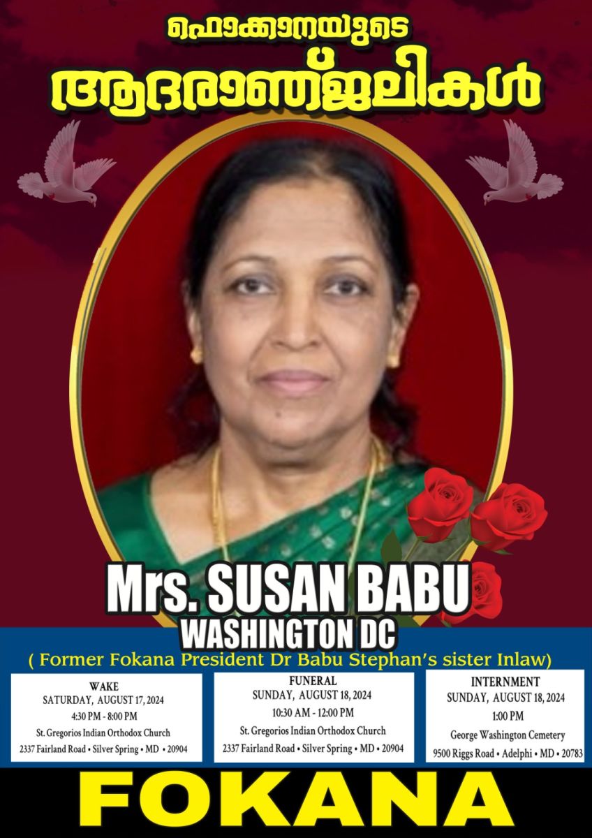 ഫൊക്കാന മുൻ പ്രസിഡന്റ് ഡോ. ബാബു സ്റ്റീഫന്റെ ഭാര്യ സഹോദരി സൂസൻ ബാബുവിന്റെ നിര്യാണത്തിൽ ഫൊക്കാന അതിയായ ദുഃഖം രേഖപ്പെടുത്തി.
