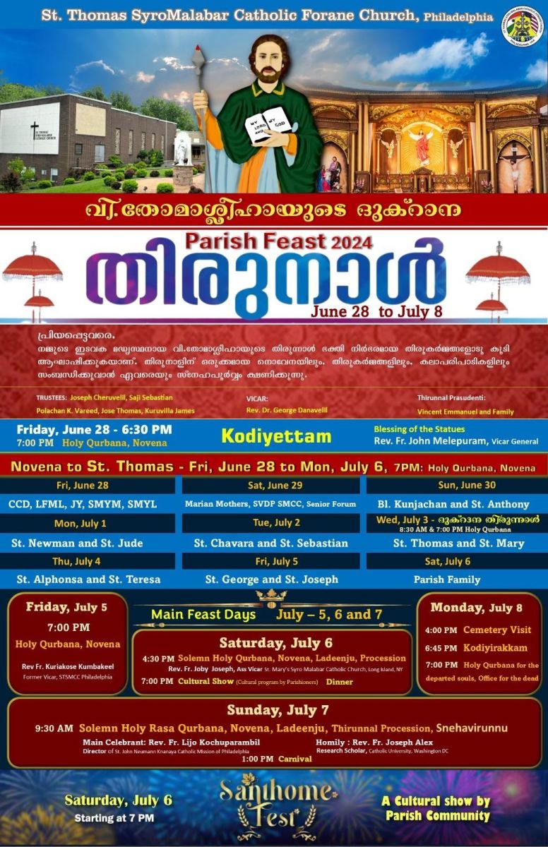 ഫിലാഡല്ഫിയ: ഭാരതഅപ്പസ്തോലനും ഇടവക മദ്ധ്യസ്ഥനുമായ വിശുദ്ധ തോമ്മാശ്ലീഹായുടെ ദുക്റാന (ഓര്മ്മ) തിരുനാളിനു സെന്റ് തോമസ് സീറോമലബാര് ഫൊറോനാ ദേവാലയത്തില് ജൂണ് 28 വെള്ളിയാഴ്ച്ച കൊടിയേറ്റത്തോടെ തുടക്കമാകും. ഇടവക വികാരി റവ. ഡോ. ജോര്ജ് ദാനവേലില്, ചിക്കാഗോ സീറോമലബാര് രൂപതാവികാരി ജനറാള് റവ. ഫാ. ജോണ് മേലേപ്പുറം എന്നിവര് സംയുക്തമായി വെള്ളിയാഴ്ച്ച വൈകുന്നേരം ആറരക്ക് തിരുനാള്കൊടി ഉയര്ത്തി പതിനൊന്നുദിവസം നീണ്ടുനില്ക്കുന്ന തിരുനാള് ആഘോഷങ്ങള്ക്കു ആരംഭം കുറിക്കും. 7 മണിക്ക് ദിവ്യബലി, തിരുസ്വരൂപങ്ങളുടെ വെഞ്ചരിപ്പ്, ലദീഞ്ഞ് എന്നിവ വെള്ളിയാഴ്ച്ചയിലെ തിരുക്കര്മ്മങ്ങളില്പ്പെടും.