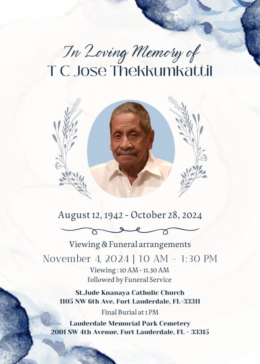 Miami :T.C. Jose Thekkumkattil (82), passed away in Miami. He originally hails from Kidangoor, Kottayam.