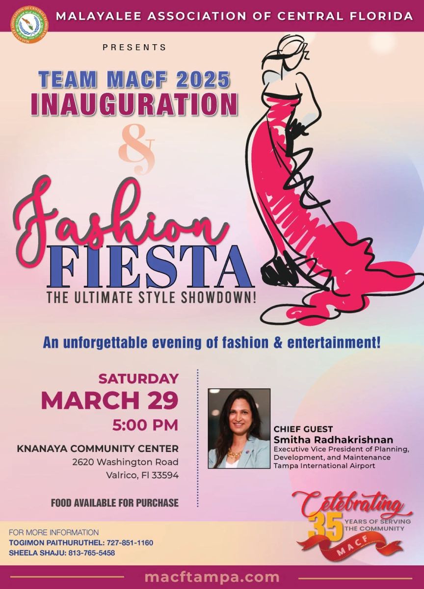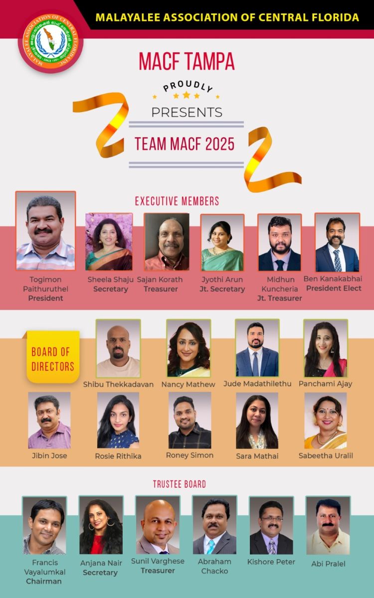 റ്റാമ്പാ : മുപ്പത്തി അഞ്ചാം വർഷത്തിലേക്കു കടക്കുന്ന സെൻട്രൽ ഫ്ലോറിഡയിലെ ആദ്യത്തെ മലയാളി സംഘടനയായ മലയാളി അസോസിയേഷൻ ഓഫ് സെൻട്രൽ ഫ്ലോറിഡ (MACF) 2025 കമ്മിറ്റിയുടെ ഔദ്യോഗിക ഉദ്ഘാടനം മാർച്ച് 29-ന് ടാമ്പാ യിലെ സേക്രഡ് ഹാർട്ട് ക്നാനായ കമ്മ്യൂണിറ്റി ഹാളിൽ( 2620 Washington Rd, Valrico, FL 33594) അതിഗംഭീരമായി നടത്തുന്നു. ശ്രീമതി സ്മിത രാധാകൃഷ്ണൻ ആണ് മുഖ്യ അതിഥി (ടാമ്പാ ഇന്റർനാഷണൽ എയർപോർട്ട് പ്ലാനിംഗ് വൈസ് പ്രസിഡന്റ്) പ്രസിഡന്റ് ടോജിമോൻ പൈത്തുരുത്തേലിന്റെയും സെക്രട്ടറി ഷീല ഷാജുവിന്റെയും ട്രെഷറർ സാജൻ കോരതിന്റെയും നേതൃത്വത്തിലുള്ള എക്സിക്യൂട്ടീവ് കമ്മിറ്റി ഇതിനോടകം എല്ലാം തയാറെടുത്തു കഴിഞ്ഞു.